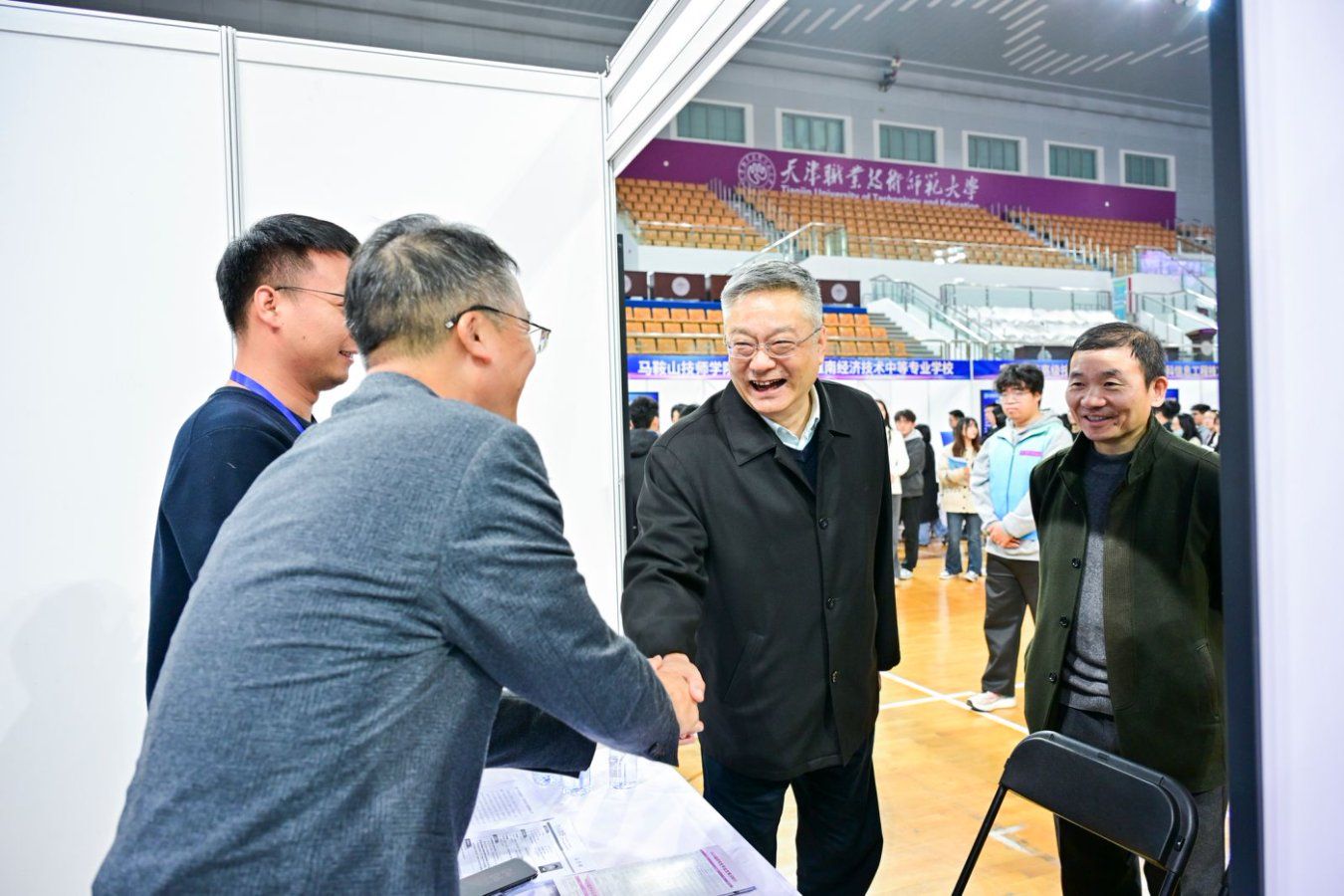 此次招聘会涵盖安徽省内17所优质技工院校,提供职教师资岗位125个。400余名毕业生提前了解招聘岗位需求、积极踊跃到现场求职,累计投递简历1000余份。招聘会现场,李富森向安徽省人社厅及各技工院校专程来校选才表示热烈欢迎,并与安徽省人社厅职业能力建设处三级调研员马军、事业能力管理处副处长王成等带队领导、技工院校招聘工作人员进行深入交流,了解毕业生求职应聘情况。