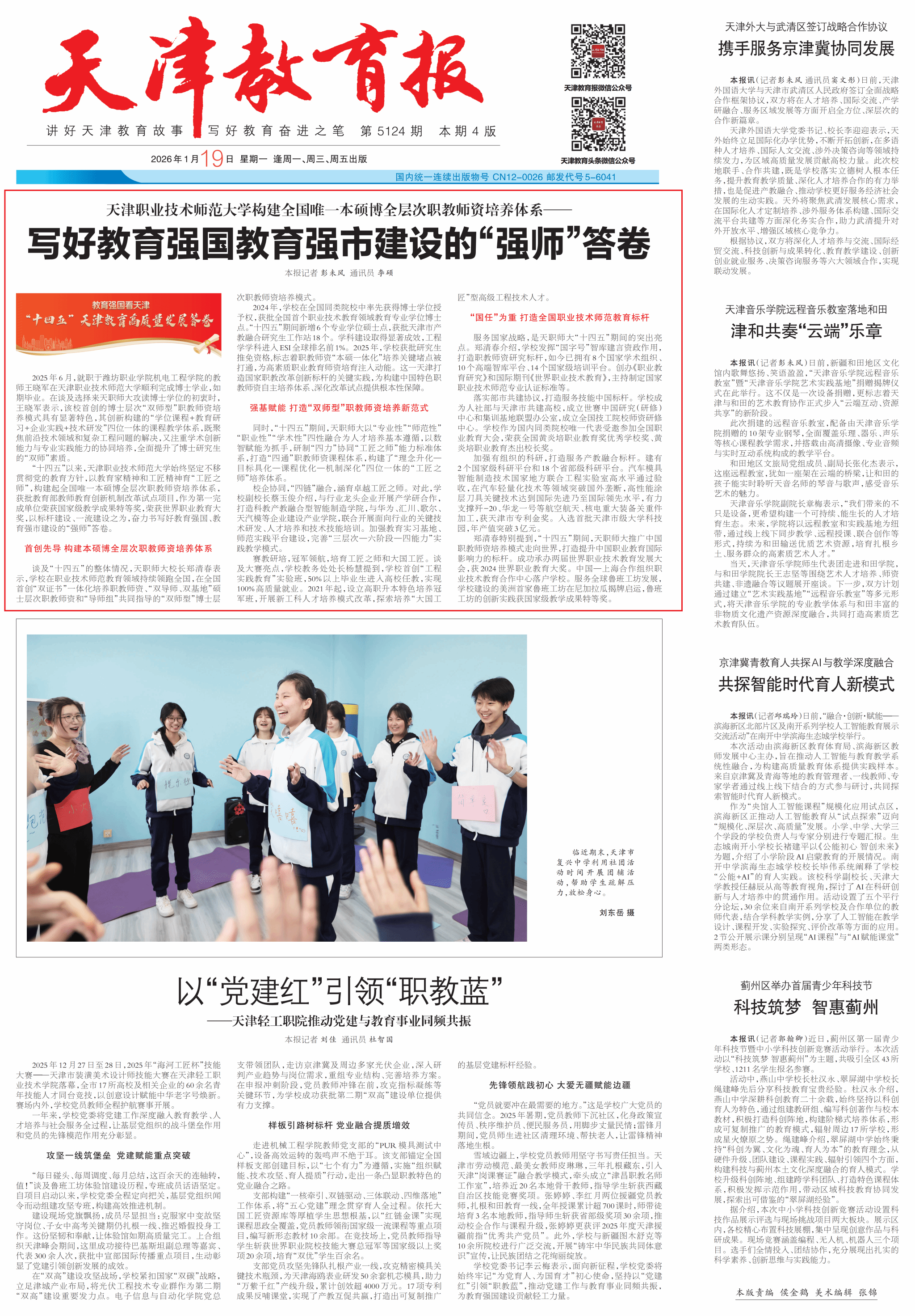 本网讯【通讯员 李硕】1月19日,《天津教育报》头版头条【教育强国看天津 “十四五”天津高质量发展答卷】专栏以“天津职业技术师范大学构建全国唯一本硕博全层次职教师资培养体系——写好教育强国教育强市建设的‘强师’答卷”为题,报道我校“十四五”高质量发展答卷。