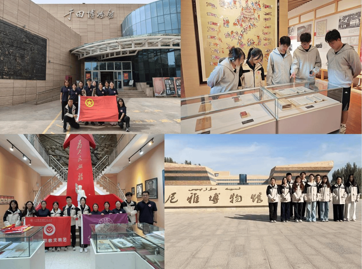 活动期间,各支教分队分别奔赴所在地的博物馆,进行了一次深刻的精神洗礼与文化寻根。在和田博物馆,和田分队支教团成员们透过精美的艾德莱斯绸与古老的桑树皮纸,探寻着古代于阗的璀璨文明与丝绸之路的千年脉络;在策勒博物馆,策勒分队的成员们则在达玛沟佛寺遗址的壁画残片与出土文物前驻足,感受着这片土地上曾经的多彩文化与宗教交融;在于田博物馆,于田分队的成员们深入了解了于田作为丝绸之路南道重镇的悠久历史,通过一件件反映当地民族交往、交流、交融的实物与史料,真切感受到了这片热土上积淀的深厚家国底蕴;在尼雅博物馆,民丰分队的成员面对着尼雅遗址出土的“五星出东方利中国”锦护臂,为跨越时空的家国预言与守护意志所深深震撼。