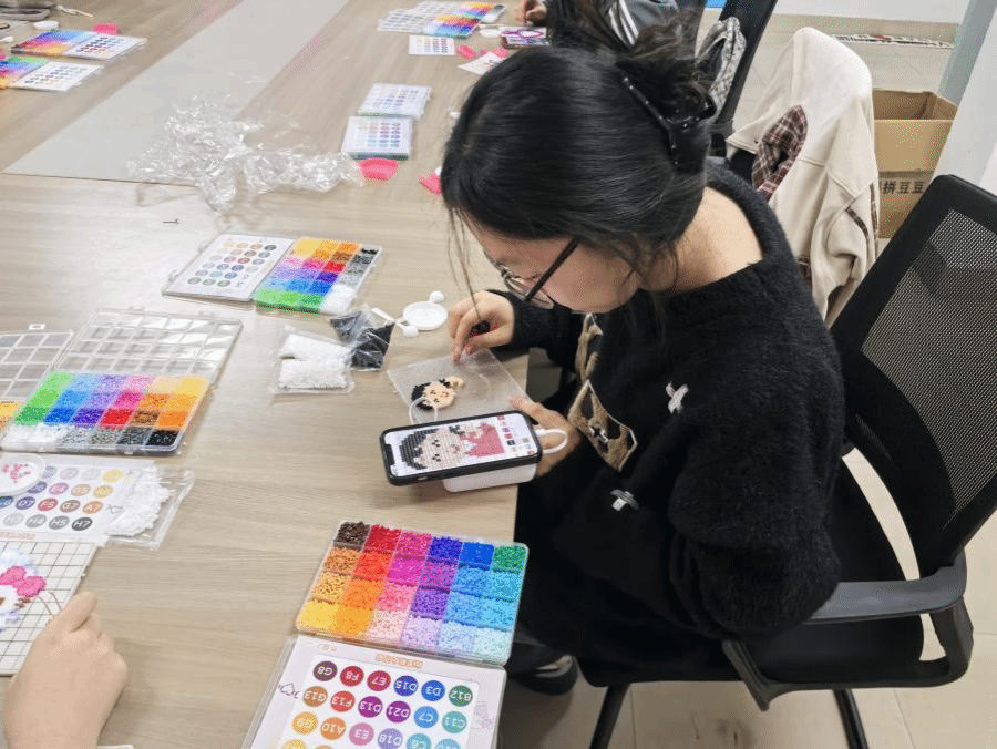 创作环节,桌面上各色拼豆如彩虹般铺展,同学们或凝神构思,或细心摆放,现场只有拼豆落板的轻响与偶尔的低声交流,同学们专注投入、认真创作。每一幅拼豆作品都独一无二:有同学拼出自己的微信头像,有同学网上搜索图纸表达自己的性格特质,还有同学将理想自我具象化为某种动物或符号。雷明细致指导并给予鼓励和启发,他提醒同学们,不要追求完美,重要的是创作过程中与自己的对话。创作完成后,同学们依次展示自己的拼豆作品,互相分享创作时的思考与感受。不少同学表示,在拼豆的过程中,身心自然而然地沉静下来,仿佛进入了一段专注而平和的“心流时间”。