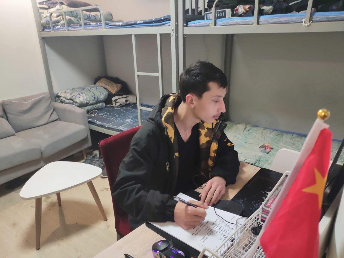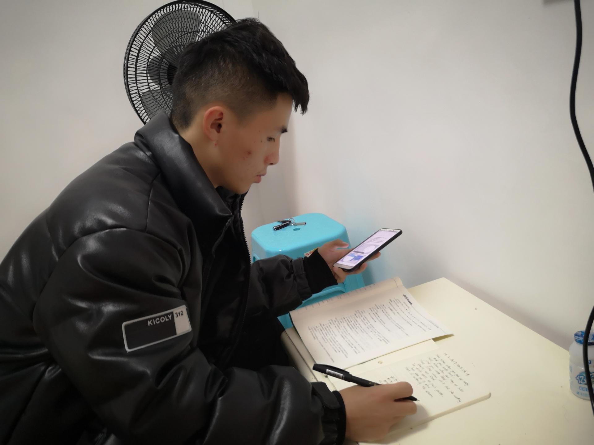 信息学院教技专业1801班学生毛萨·艾力。为了准时上好第一二节的课程,艾力要克服与天津二个半小时的时差。为了不影响家里人休息,他早早起床悄悄去别的房间学习。2月的新疆早晨寒冷,他要努力克服顾不上吃早餐,上课有时会犯困的难题。新疆地区网络信号不流畅,时常断网,导致他不能完全集中注意力去听课。但他表示,老师课讲得很好,跟同学们有互动,他很喜欢这种教学方式。虽然学习条件不好,家里没有计算机,但是这更加坚定了他努力学习的决心,因为他坚信学习改变命运,智慧改变生活。