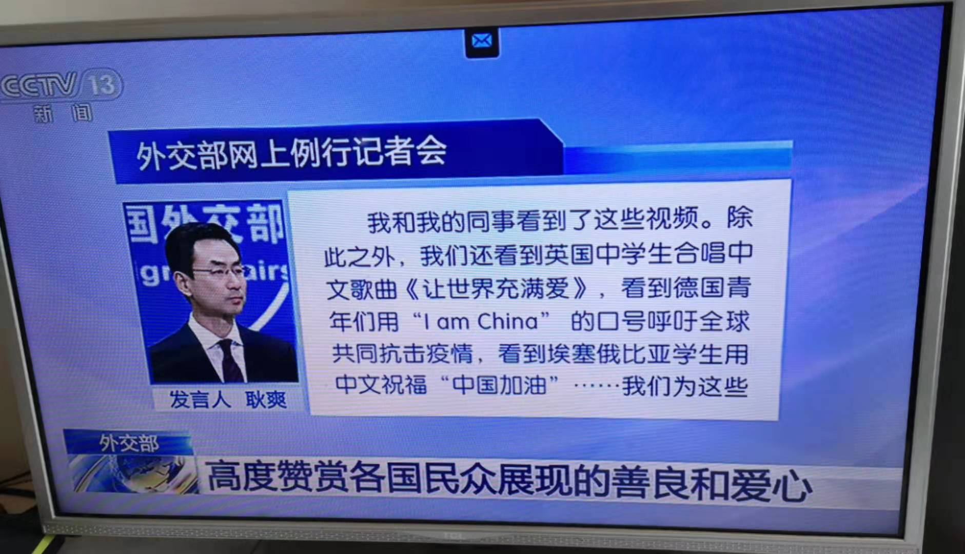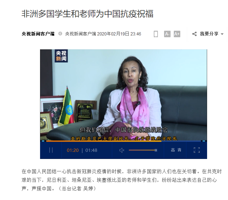 央视新闻客户端登载微视频:“武汉加油!中非患难与共的兄弟情谊”,选取了埃塞孔院学员用“英吉拉(埃塞主食)为热干面(武汉)加油”的视频;客户端还宣传了亚的斯亚贝巴大学校长Dr. Tassew Woldehanna和副校长 Dr. Emebet Mulugeta 参与了中央电视台的视频录制,热心教职工表达了对中国必胜的信心,学生们在亚大校门前大声喊出“中国加油”的口号。外交部发言人耿爽主持网上例行记者会时提到,看到了埃塞俄比亚学生用中文祝福“中国加油”等多国青少年支持中国的视频,中方为这些暖心视频点赞,对各国民众特别是青少年自发举动展现出的正直、善良、勇气和爱心表示高度赞赏和由衷感谢,并在外交部发言人办公室公众号平台转发埃塞职教孔院公众号链接。波黑巴尼亚卢卡大学孔子学院外方院长李莲娜参加当地国家电视台访谈节目,讨论就新冠肺炎疫情如何向中方提供支持,孔院师生也录制了祝福视频为中国、武汉加油。