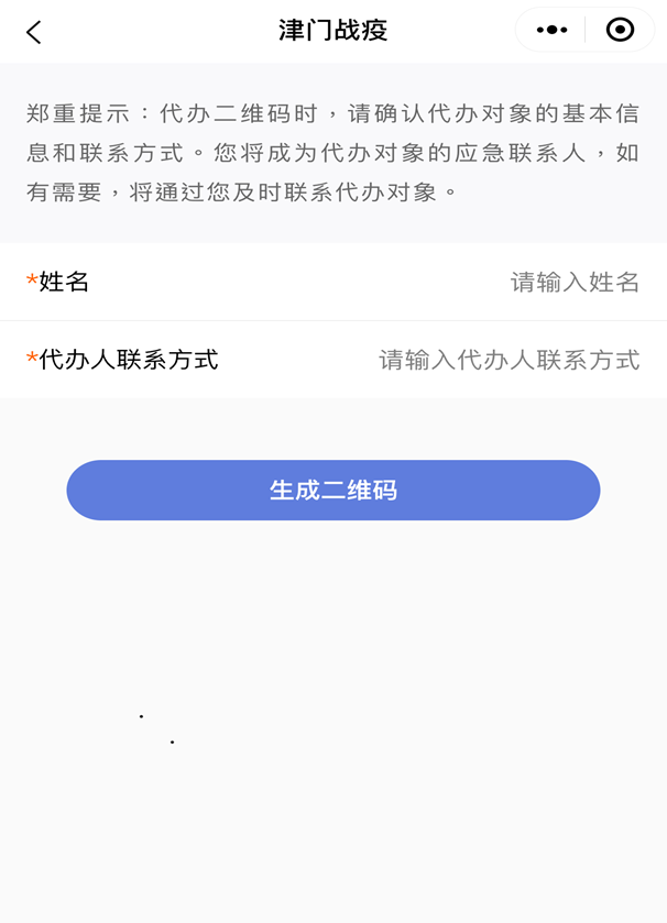 使用“为人代办”模块中的“为他人生成二维码”功能,为无微信的亲属、朋友代办二维码,生成的二维码可截图或打印使用(此二维码仅生成一次,务必留存)。由其进入公共场所时主动出示,以备核验。