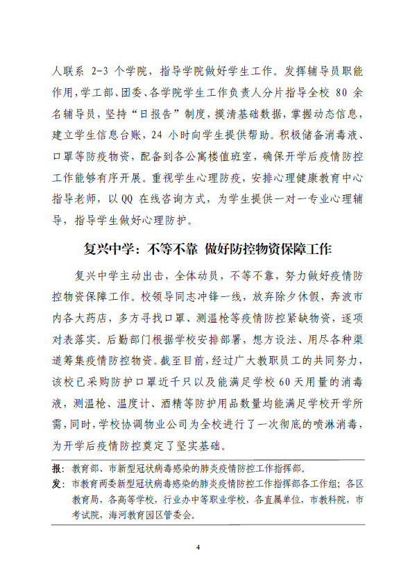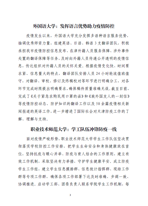 面对疫情严峻形势,职业技术师范大学学生工作队伍坚决贯彻落实学校防控工作安排,把学生生命安全和身体健康放在首位,坚持抗疫与暖心并举、防疫与育人结合的工作原则,建立有效工作机制,采取坚决有力举措,守护学生健康平安。成立防疫学生工作组,建立学生信息摸排群、信息统计指挥群、现场工作群等专项工作群,确保各项工作部署下达及时准确、步调一致、协调推进。启动学工部、团委负责人联系学院学生工作机制,每人联系2-3 个学院,指导学院做好学生工作。发挥辅导员职能作用,学工部、团委、各学院学生工作负责人分片指导全校80 余名辅导员,坚持“日报告”制度,摸清基础数据,掌握动态信息,建立学生信息台账,24 小时向学生提供帮助。积极储备消毒液、口罩等防疫物资,配备到各公寓楼值班室,确保开学后疫情防控工作能够有序开展。重视学生心理防疫,安排心理健康教育中心指导老师,以QQ 在线咨询方式,为学生提供一对一专业心理辅导,指导学生做好心理防护。