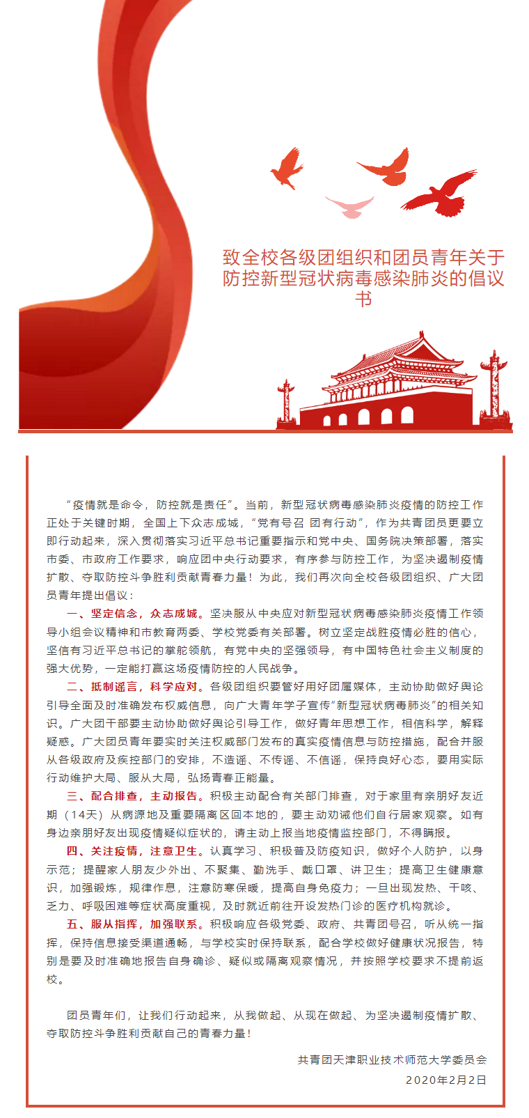 【战“疫”进行时】致全校各级团组织和团员青年关于防控新型冠状病毒感染肺炎的倡议书