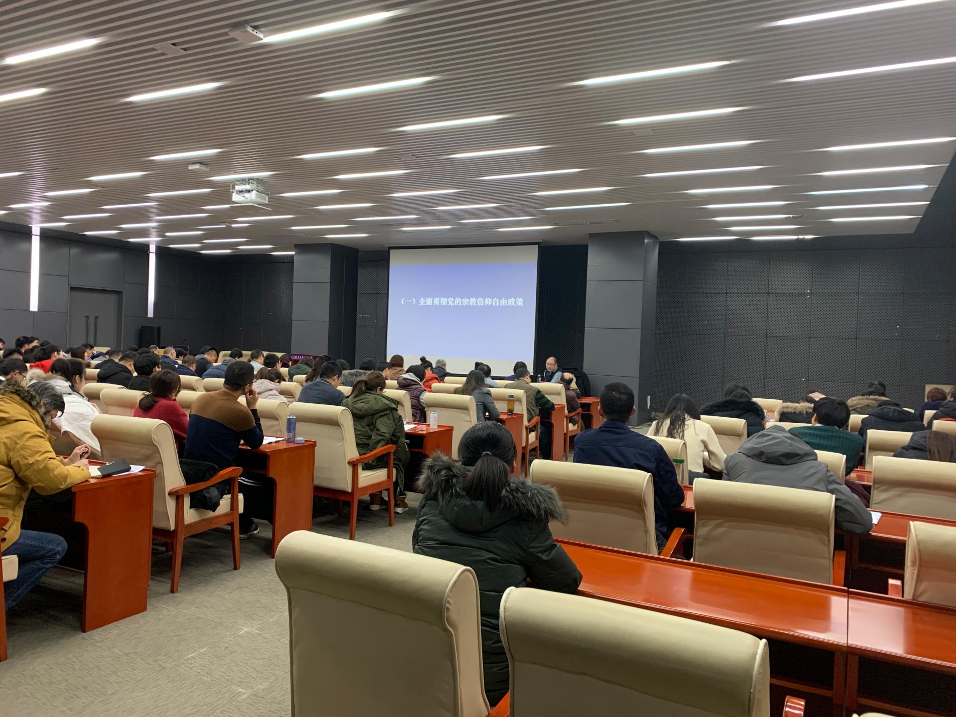 本网讯【通讯员 余瑛】2019年12月31日,党委统战部邀请天津市民族与宗教事务管理委员会办公室冯涛来我校作关于“高校宗教工作要把握的几个方面”专题讲座,进一步贯彻落实习近平总书记关于宗教工作的重要论述,加强对《宗教事务条例》的学习宣传,提升我校管理干部宗教工作的能力和水平。