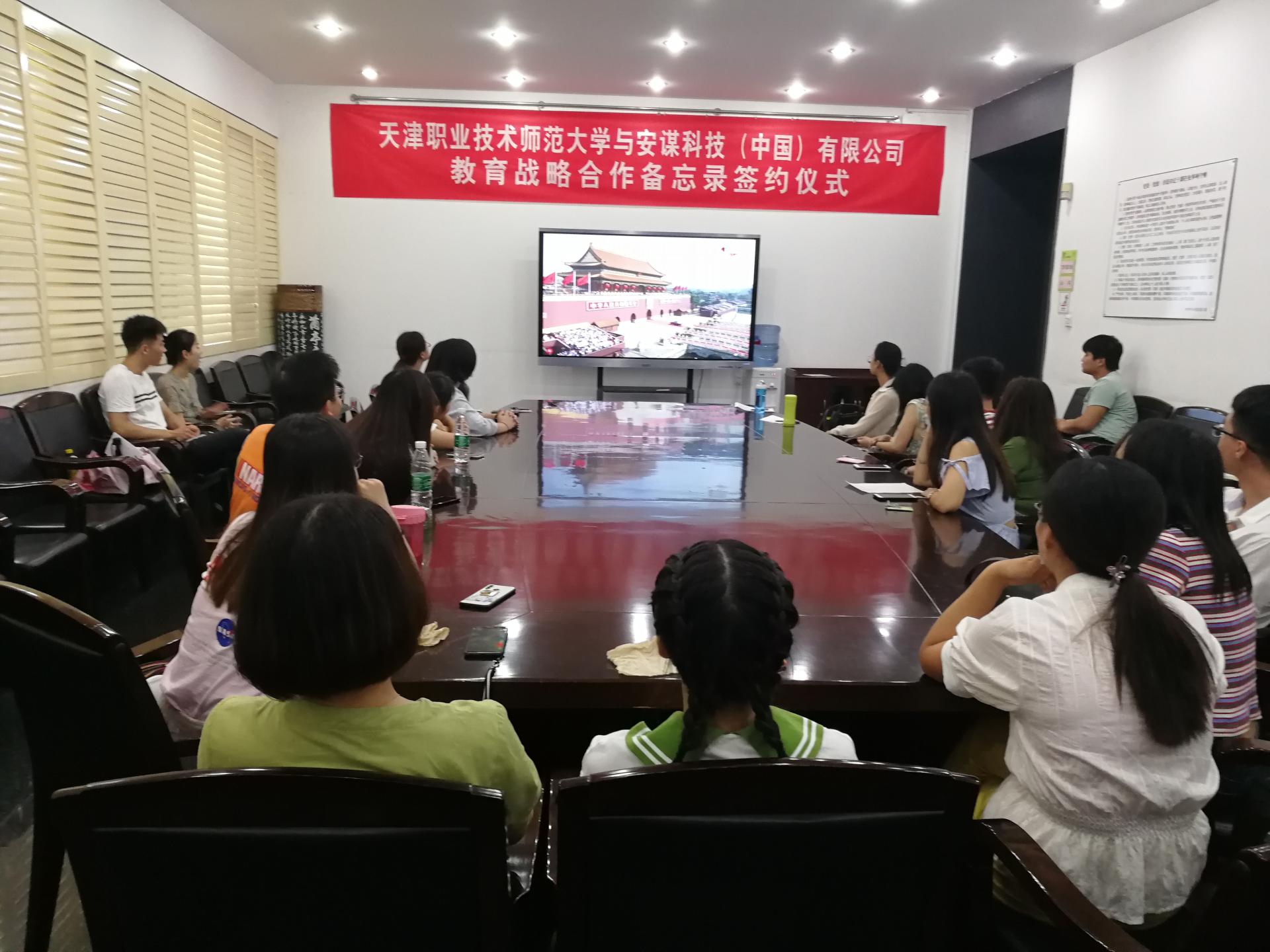 当庄严的国歌声响彻天安门广场,五星红旗冉冉升起,观看直播的师生情不自禁的也起立,向国旗行注目礼。