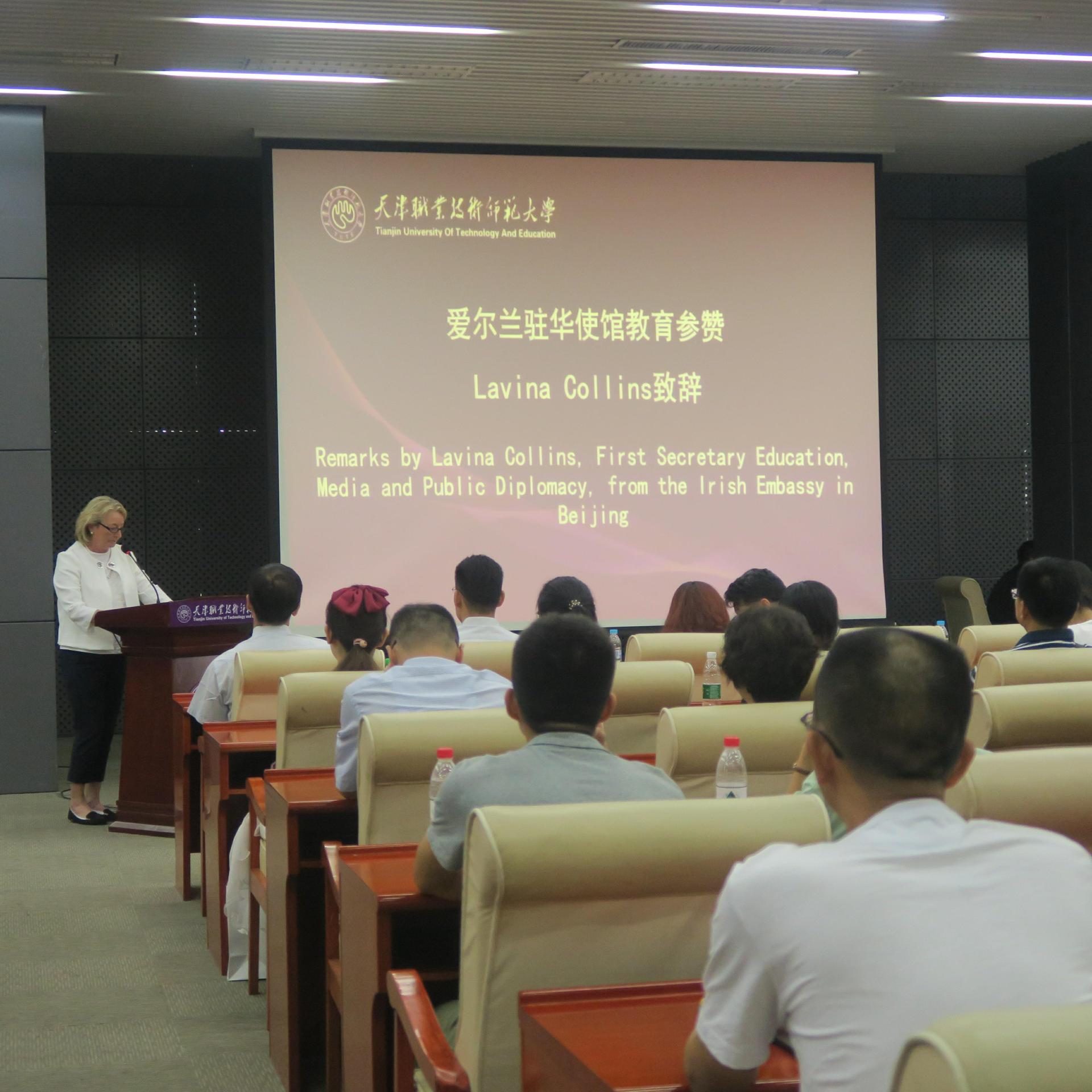 Lavina Collins参赞代表爱尔兰驻华大使馆和爱尔兰高等教育推广署表示,大力支持爱尔兰斯莱戈理工学院和天职师大合作办学项目。她在重点介绍爱尔兰教育资源、留学爱尔兰的发展优势和电子信息工程专业职业环境之后,对同学们提出希望、专注学习、不断进步、拓宽视野,成长为独立自信的国际化人才。