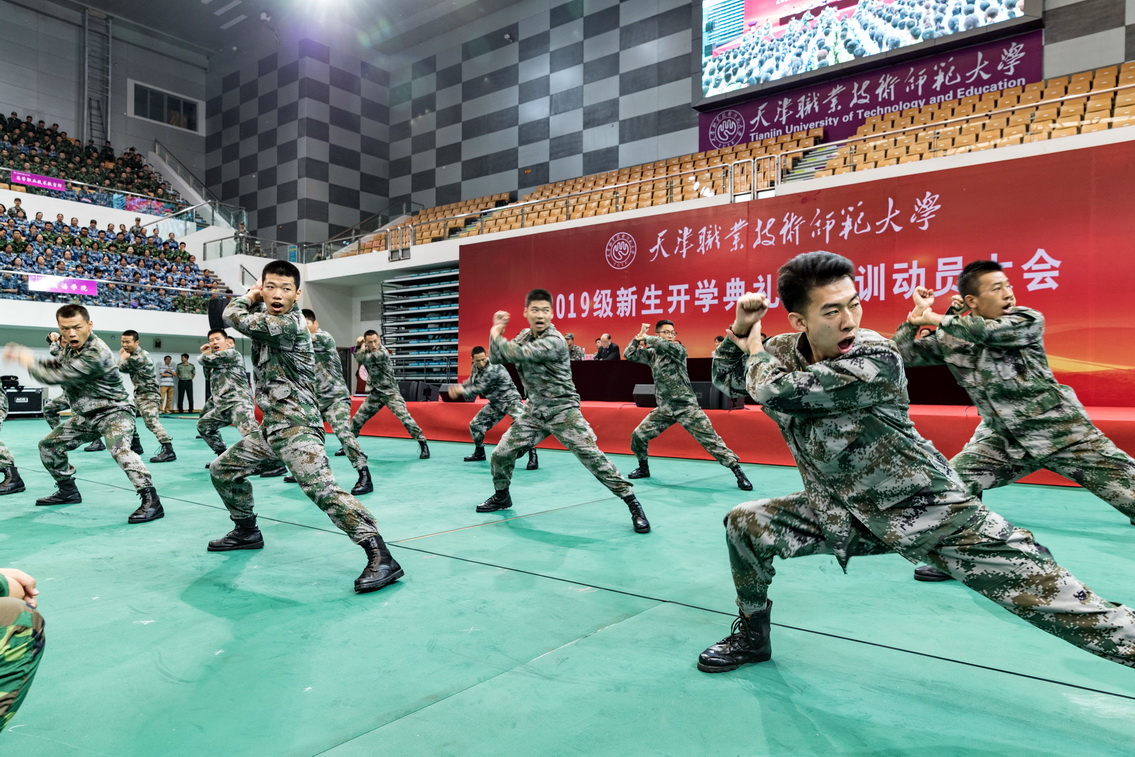 动员大会上,高年级学生代表和军训教官分别进行擒敌拳、搏击训练表演和队列展示,赢得了全场热烈掌声。