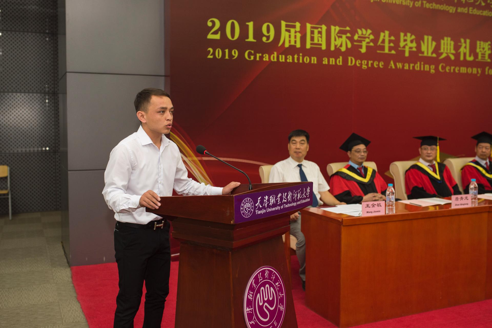 来自塔吉克斯坦的汉语进修生杜礼时作为毕业生代表发言,深情地回忆自己和同学们在天职师大的校园时光,对学校细心呵护学生成长深表感恩。机械工程学院赵巍老师作为教师代表发言,希望毕业生真正做到学以致用,无愧于母校的培养。