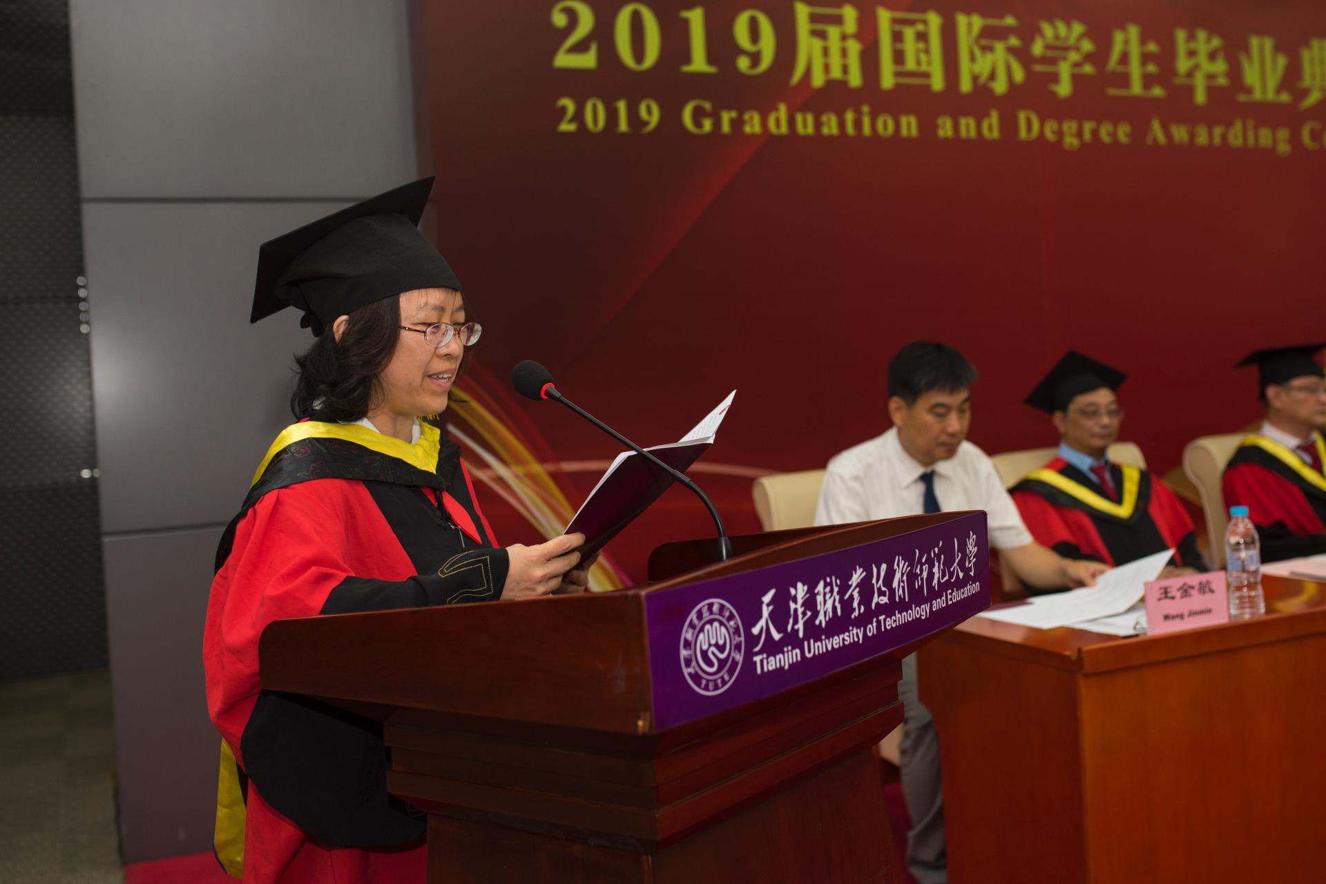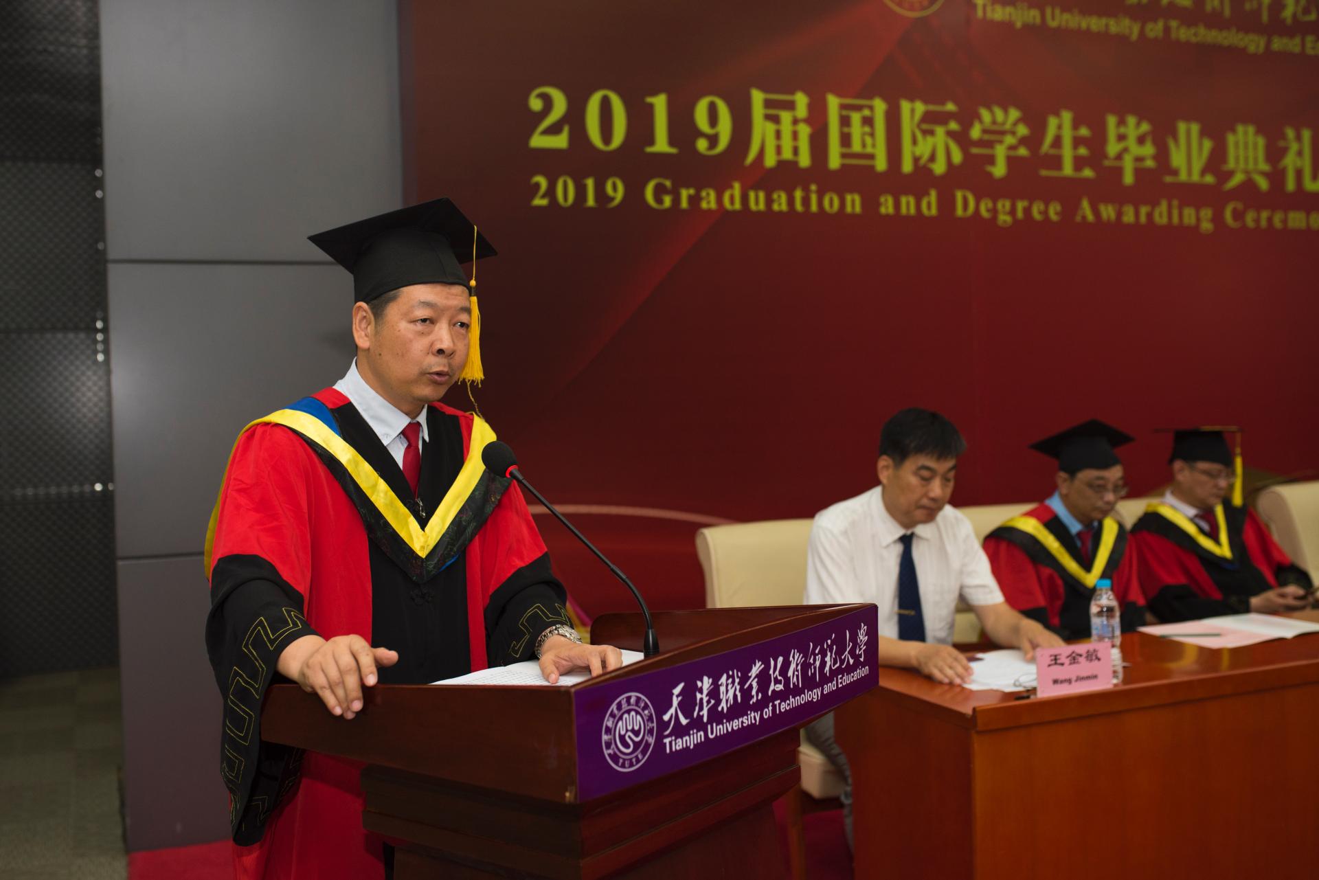 阎兵在毕业致词中寄语毕业生功崇惟志,业广惟勤,久久为功;在伟大的时代,用理想指引人生方向;勤于学习,善于实践,用所学知识为各自国家的建设添砖加瓦,追逐并实现自己的梦想。毕业生今后不论在何时何地,希望都能成为中外友好交流的使者,在世界各地展示天职师大人的风采。