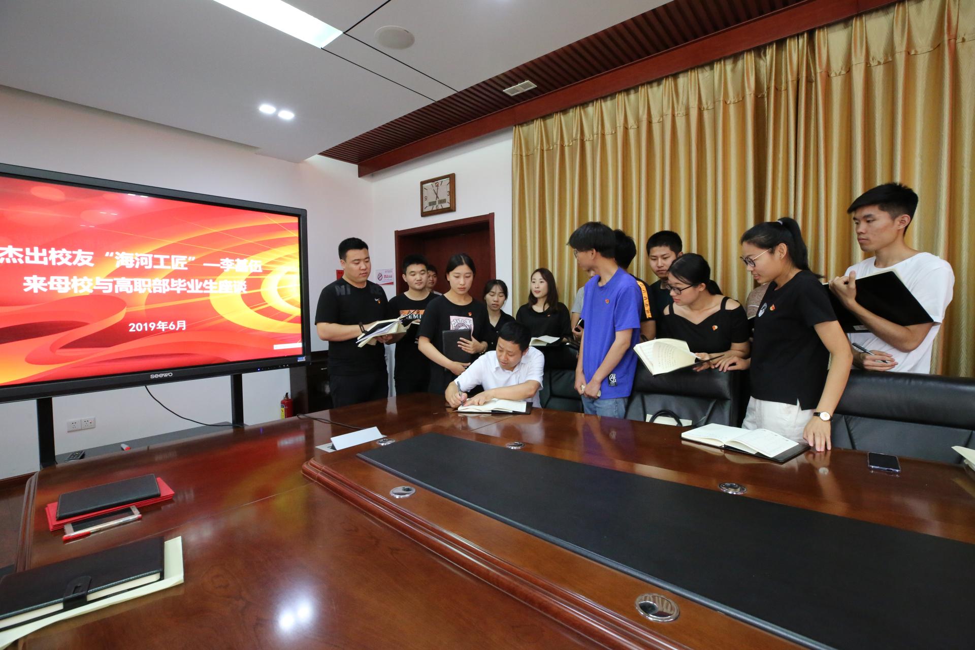 本网讯(通讯员 张朝玉)6月13日,杰出校友“海河工匠”李基伍应邀来校参加高职部2019届校友联络大使聘任仪式并与母校毕业生座谈,进一步加强学院与校友、校友与在校同学之间的交流。高职部党委书记张世龙、副主任姚丽华出席,高职团委辅导员和毕业生代表参加。