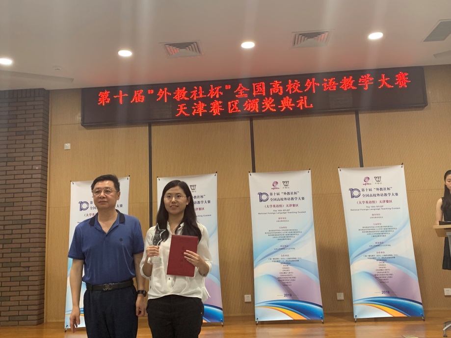 本网讯(通讯员 吕新颖)5月26日,第十届“外教社杯”全国高校外语教学大赛天津赛区(大学英语组)决赛在天津大学举行。我校外国语学院教师才萌喜获(视)听说课组特等奖。