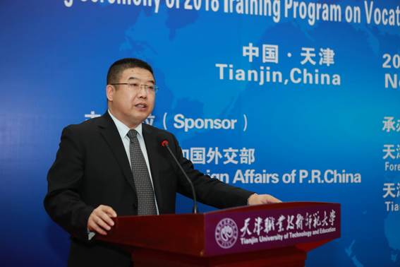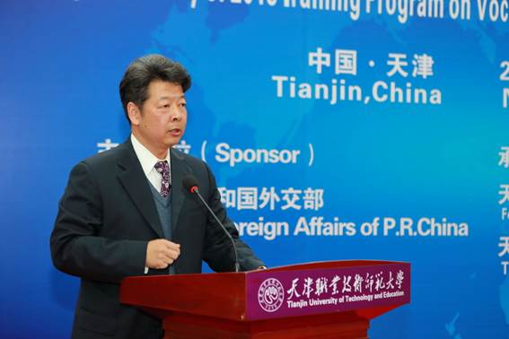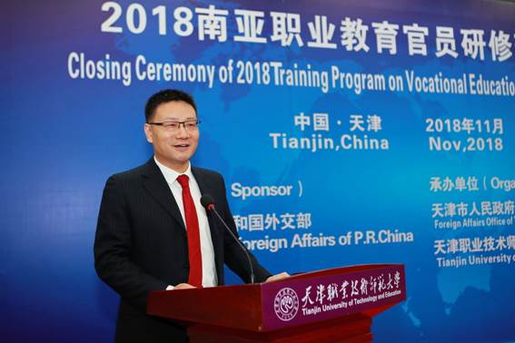 本网讯(通讯员 张媛远)11月14日,由外交部主办、天津市人民政府外事办公室和我校联合承办的“2018年南亚职业教育官员研修班”结业仪式在国际学院报告厅举行,来自斯里兰卡、阿富汗、巴基斯坦等南亚5个国家的11位职业教育官员完成研修。外交部亚洲司一等秘书江伟,天津市人民政府外事办公室副主任赵剑岭,天津职业技术师范大学党委副书记、校长刘欣出席,在结业仪式上分别致辞并为学员颁发证书。仪式由天津职业技术师范大学党委常委、副校长阎兵主持。