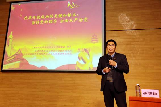 本网讯(通讯员 安秀芳)10月30日,市高校思想政治理论宣讲“教授团”巡讲报告会在我校举行。“教授团”成员、天津师范大学马克思主义学院副院长,博士生导师,天津市思想政治理论课名师工作室——李朝阳工作室负责人李朝阳教授做题为《改革开放成功的关键与根本——坚持党的领导、全面从严治党》巡讲报告。