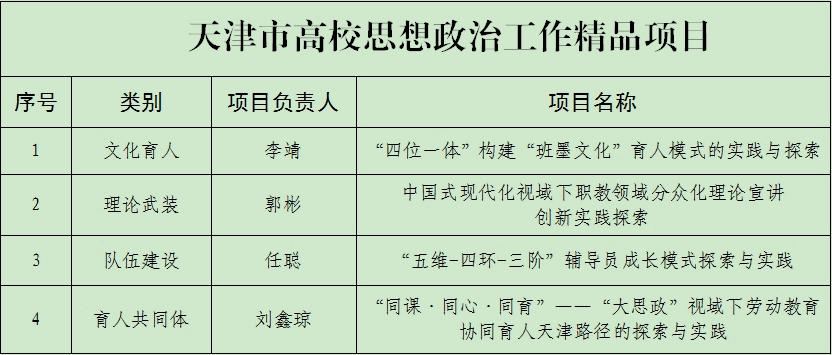 本网讯【通讯员 赵苏东】近日,天津市委教育工委、市教委公布了2025年度天津市高校思想政治工作精品项目结项名单和2026年度天津市高校思想政治工作精品项目立项名单。我校2025年度立项的3个项目全部顺利通过结项验收,2026年度在8个项目类别中成功获批4个项目类别立项,获批数量位居全市高校前列,充分彰显了学校在思想政治工作中的创新实践与显著成效。