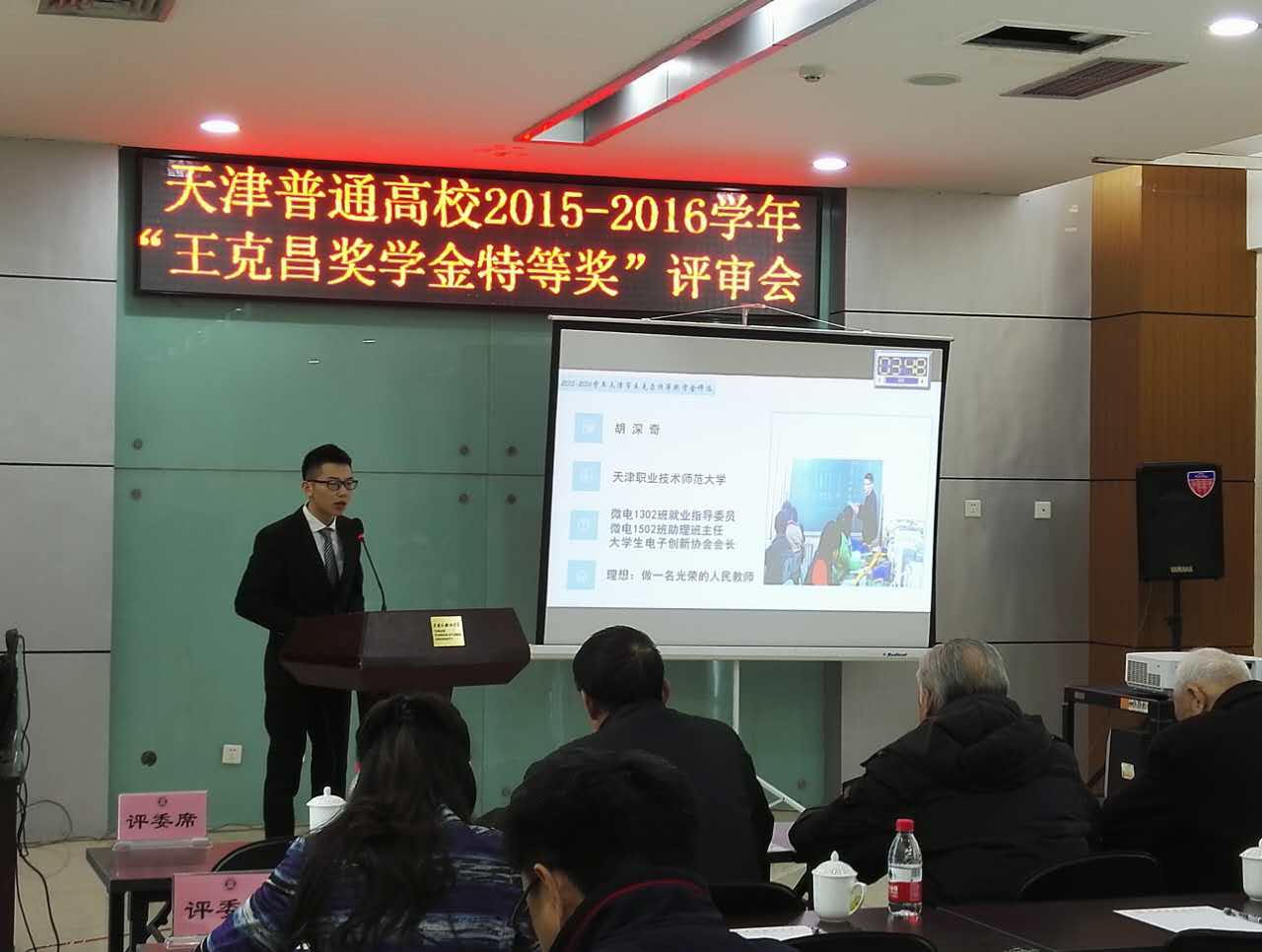 12月1日,天津市普通高校2015-2016学年“王克昌奖学金”特等奖评审会在天津外国语大学举行。经过激烈角逐,我校电子工程学院微电子专业2013级本科生胡深奇从天津市15所高校优秀学生候选人中脱颖而出,荣获特等奖。“王克昌奖学金”特等奖每年仅10个获奖名额。