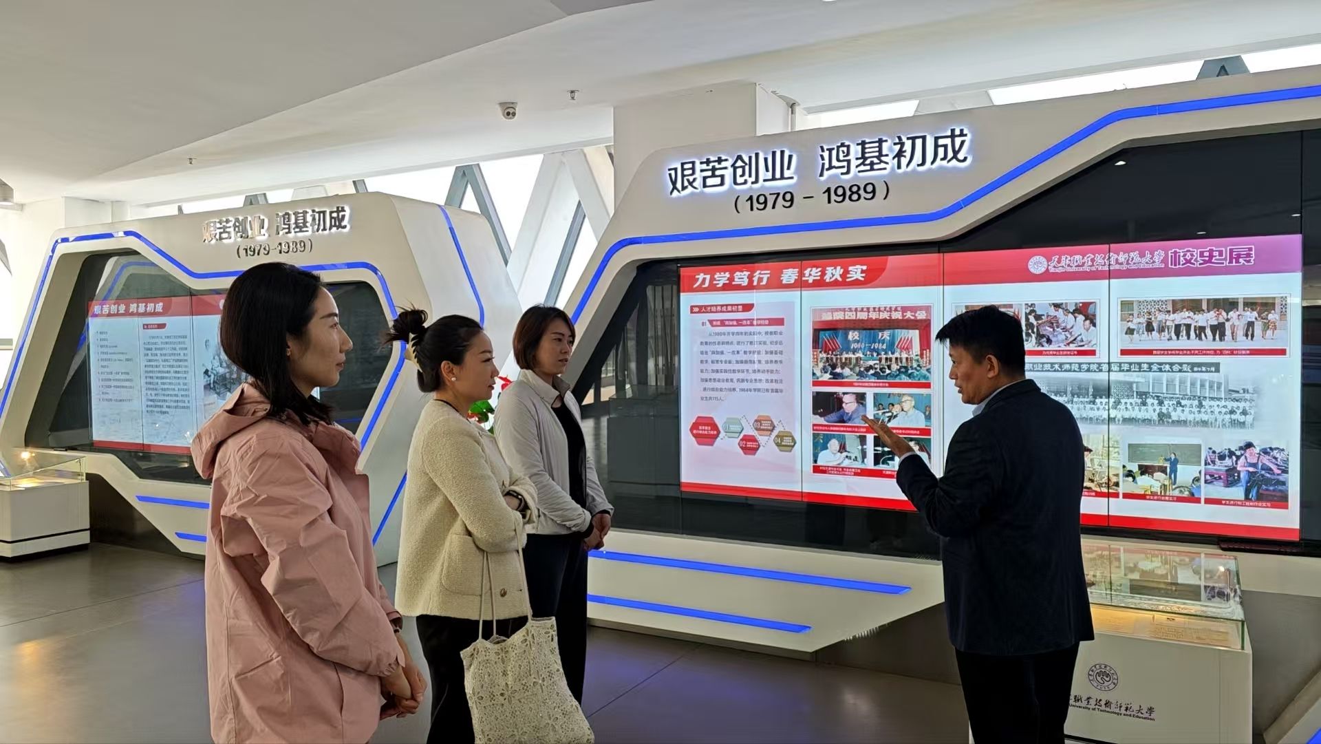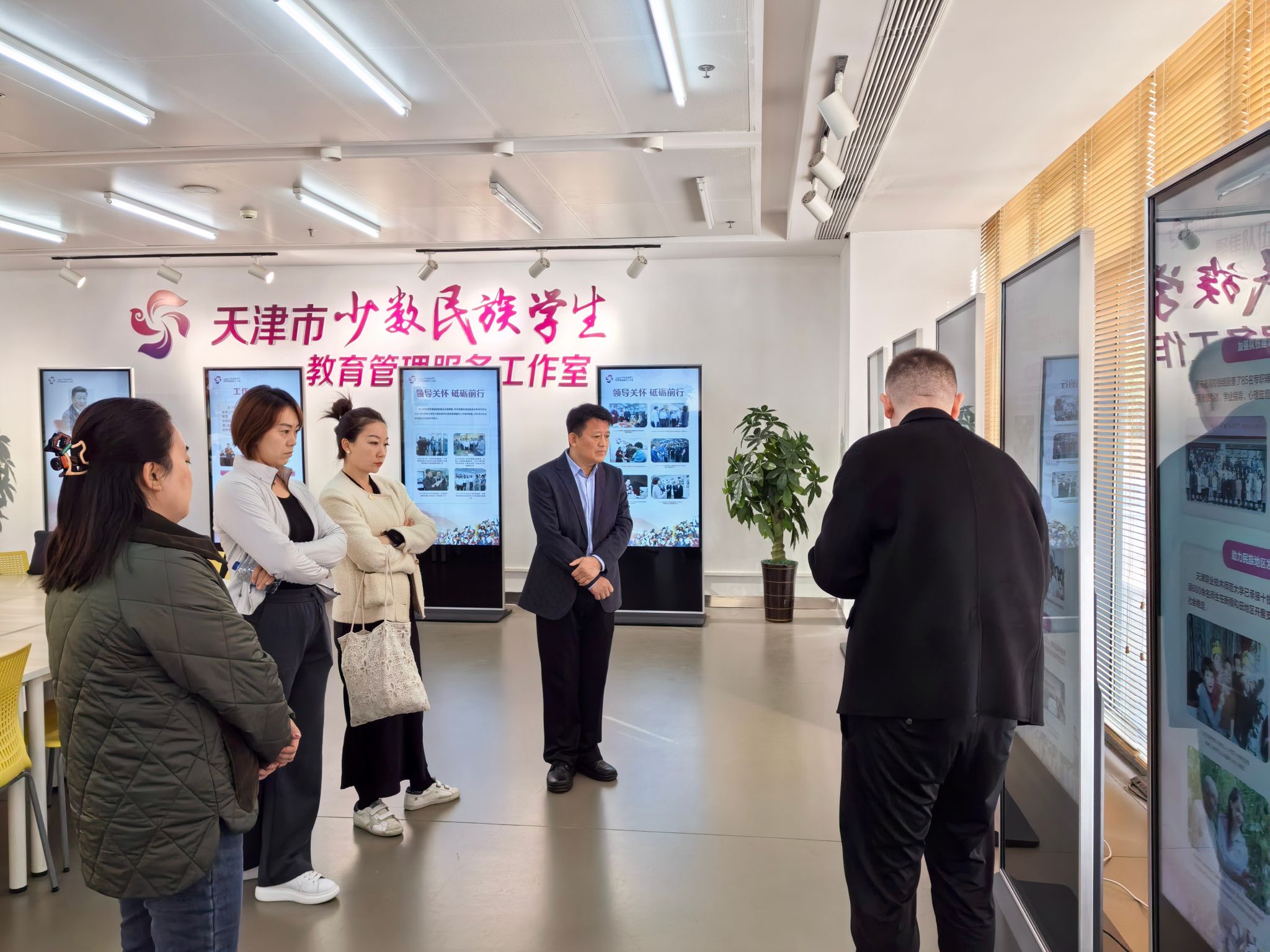 任雪浩代表学校欢迎闫东洁一行的到来,感谢中国日报长期以来对学校各方面工作给予的关注与支持,详细介绍了学校的办学特色和近年来在教育教学、科研创新、国际交流等方面取得的显著成绩。闫东洁一行观看了学校宣传片,参观了校史展以及设立在我校的天津市铸牢中华民族共同体意识教育实践思政课重点实验室、天津市大学生民族文创设计作品展厅和天津市少数民族学生教育管理服务工作室,深入了解了学校的办学特色、发展历程和我校“津门石榴红”铸牢中华民族共同体意识实践育人基地的建设情况。