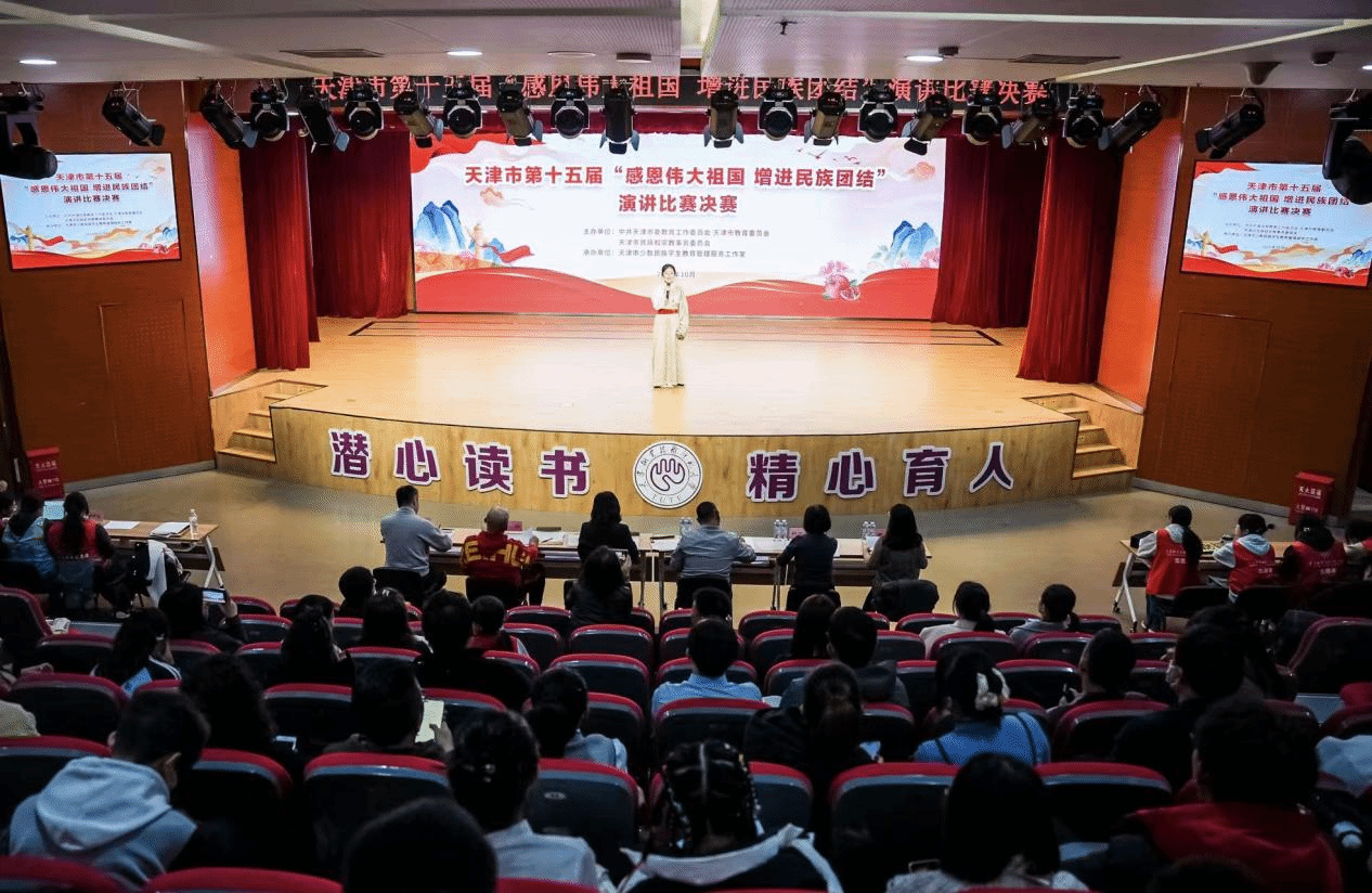 【通讯员 迪力夏提】10月25日,天津市第十五届“感恩伟大祖国,增进民族团结”主题演讲比赛、第十届高中班普通话比赛在我校大学生活动中心圆满落幕。此次活动由中共天津市委教育工作委员会、天津市教育委员会、天津市民族和宗教事务委员会联合主办,天津市少数民族学生教育管理服务工作室承办,汇聚了全市63支代表队,覆盖不同群体,以语言为纽带铸牢中华民族共同体意识。校党委常委、副校长李富森,天津市民族和宗教事务委员会民族二处处长穆怀寅以及8名专业评委应邀出席活动。