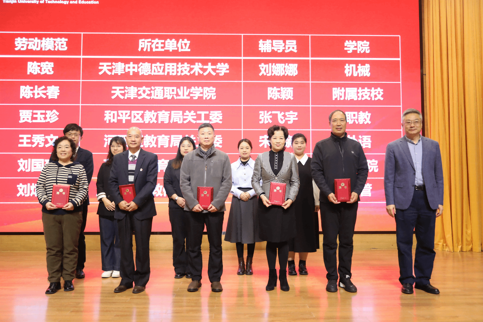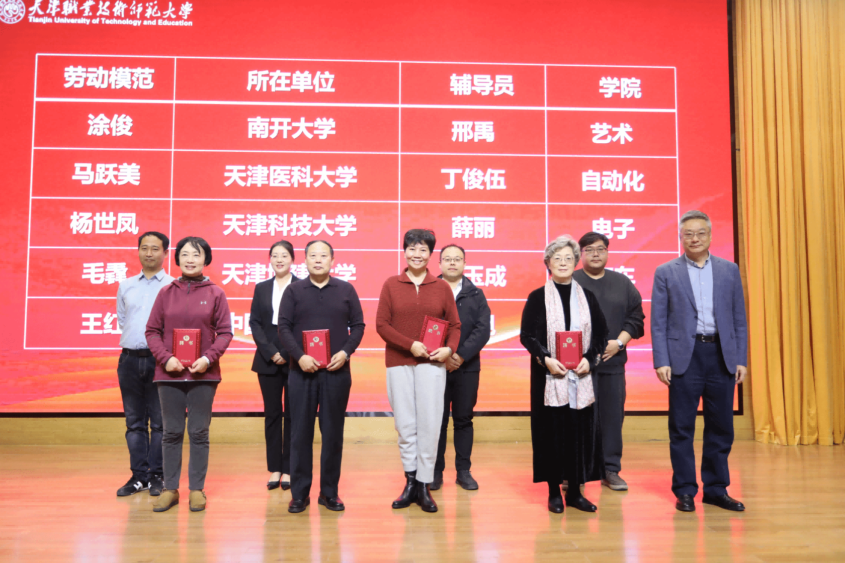 拜师仪式环节,李富森为9位校外劳动模范颁发聘书,青年辅导员与劳动模范师父合影,标志着劳模精神、劳动精神、工匠精神通过“师徒结对、精神传承”的方式在我校落地生根。