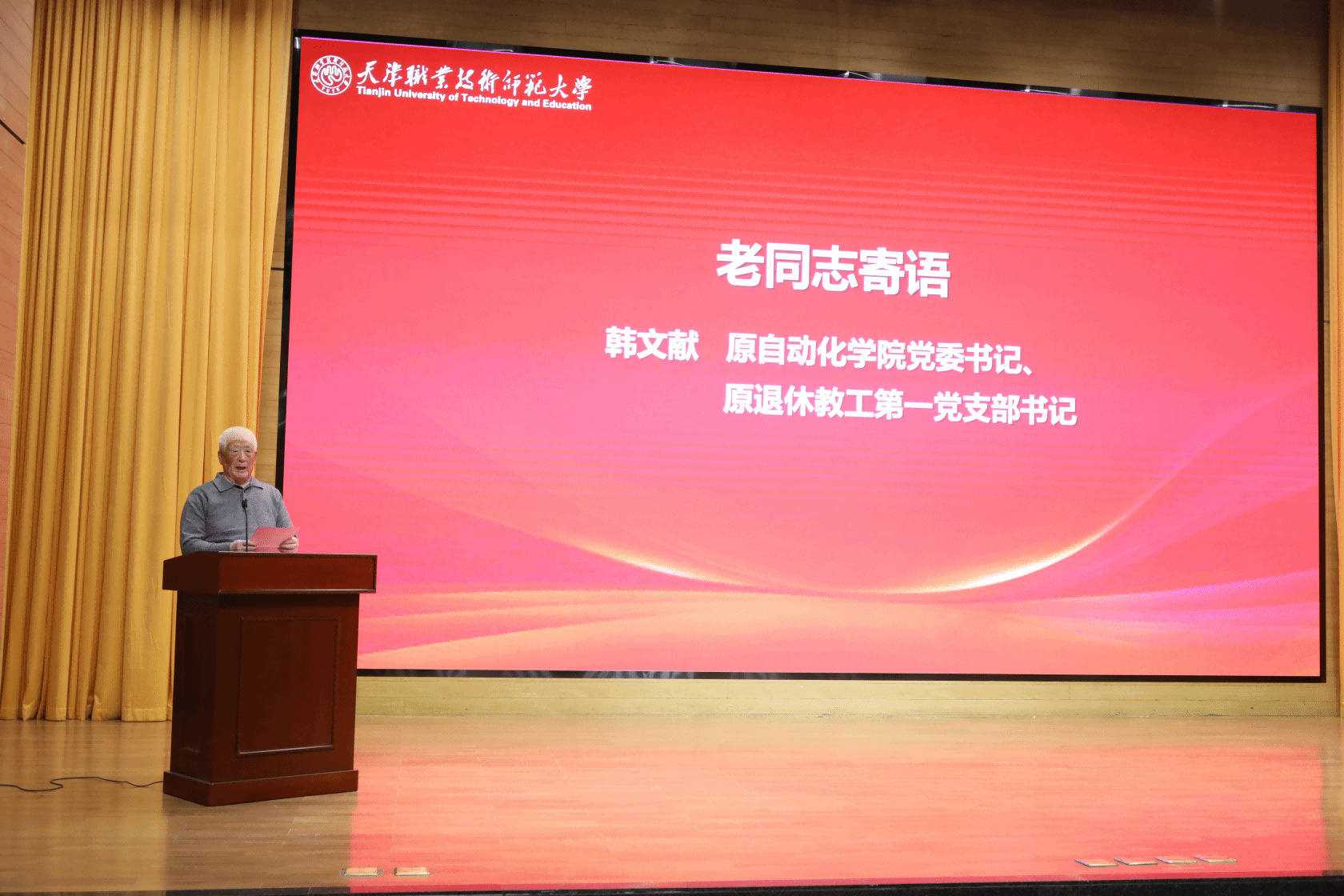 原自动化与电气工程学院党委书记、退休教工第一党支部书记韩文献作为老同志代表发言,他深情回顾了自己与学校共同成长的岁月,表达了对校党委关怀老同志的感激之情,并寄语青年教师和学子,要坚守初心、锤炼本领、传承精神、担当使命。