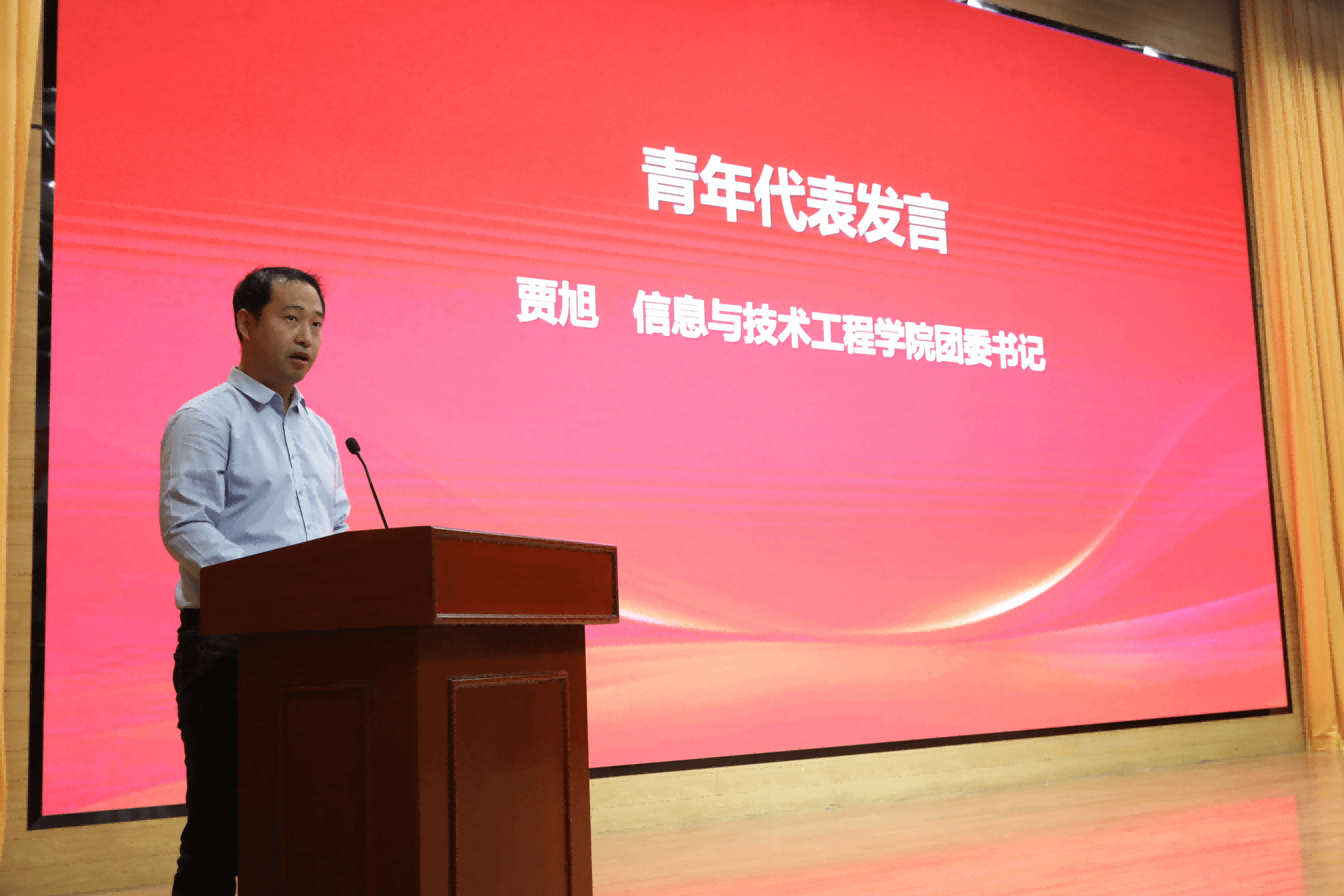 信息技术工程学院辅导员贾旭代表全体青年教师发言,表示将以老同志和劳模为榜样,脚踏实地、奋发有为,接过“关心下一代”的接力棒,为学校发展贡献青春力量。
