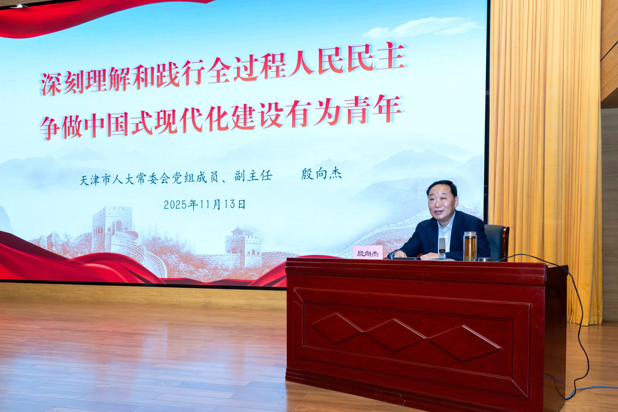 殷向杰以《深刻理解和践行全过程人民民主,争做中国式现代化建设有为青年》为题,围绕全过程人民民主是中国共产党探索民主新路的百年历史结晶、深刻理解和把握全过程人民民主的内涵要义、全过程人民民主的天津人大实践三个方面,与大家交流思想、分享体会、畅谈感悟。殷向杰指出,全过程人民民主是社会主义民主政治的本质属性,是中国共产党团结带领人民追求民主、发展民主、实现民主的伟大创造,是最广泛、最真实、最管用的民主。市人大常委会深入贯彻落实习近平总书记关于坚持和完善人民代表大会制度的重要思想,不断丰富民主形式、拓宽民主渠道,推动全过程人民民主在天津落地生根、焕发活力,为地方治理体系和治理能力现代化注入强劲动力。