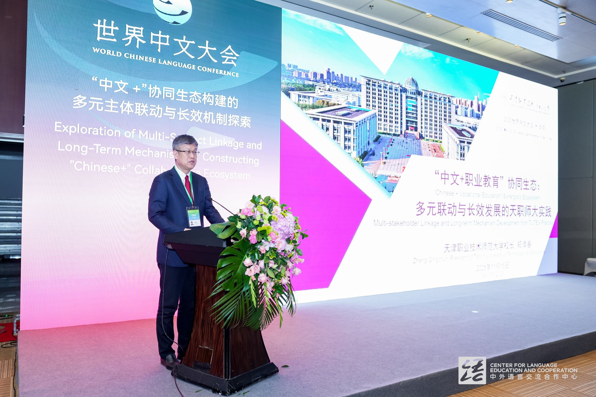 郑清春以《“中文+职业教育”协同生态:多元联动与长效发展的天职师大实践》为题,在平行论坛上从学校职教师资培养特色、世界职业教育成果的共享平台、孔子学院“中文+”的多元实践和“中文+职业教育”协同生态的构建四个维度分享了我校在“中文+职业教育”协同生态构建中的实践与思考。郑清春表示,学校将继续深化"中文+职业教育"协同生态的构建,推动多元主体联动与长效机制探索,与全球合作伙伴携手共同为世界职业教育和中文教育的发展贡献力量。