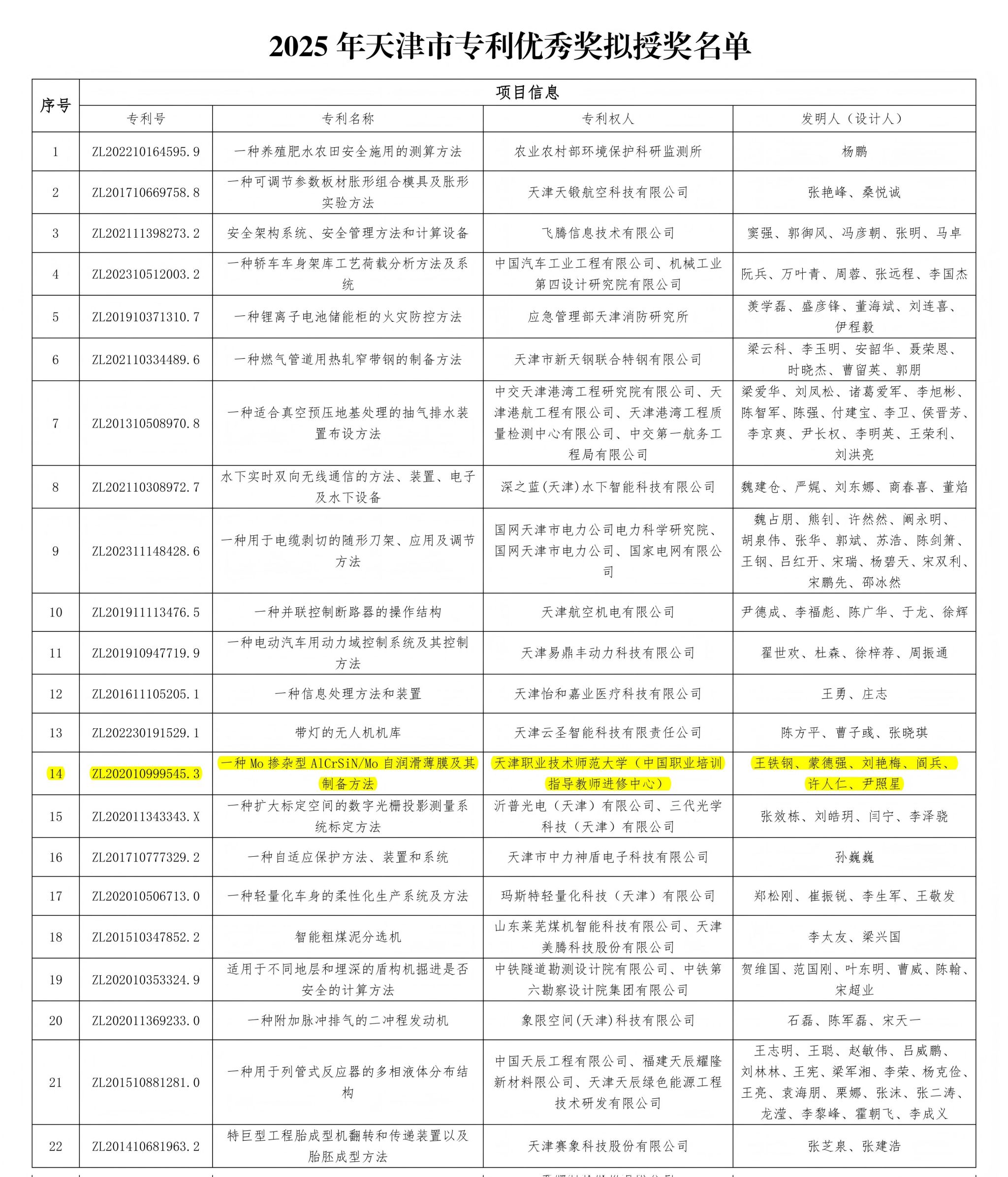 本网讯【通讯员 张恩凤】日前,天津市知识产权局正式公布了2025年天津市专利奖获奖名单,我校机械工程学院王铁钢教授团队研发的“一种Mo掺杂型AlCrSiN/Mo自润滑薄膜及其制备方法(专利号:ZL202010999545.3)”荣获2025年天津市专利优秀奖。同时该专利被中国机械制造工艺协会推荐参评第二十六届中国专利奖。