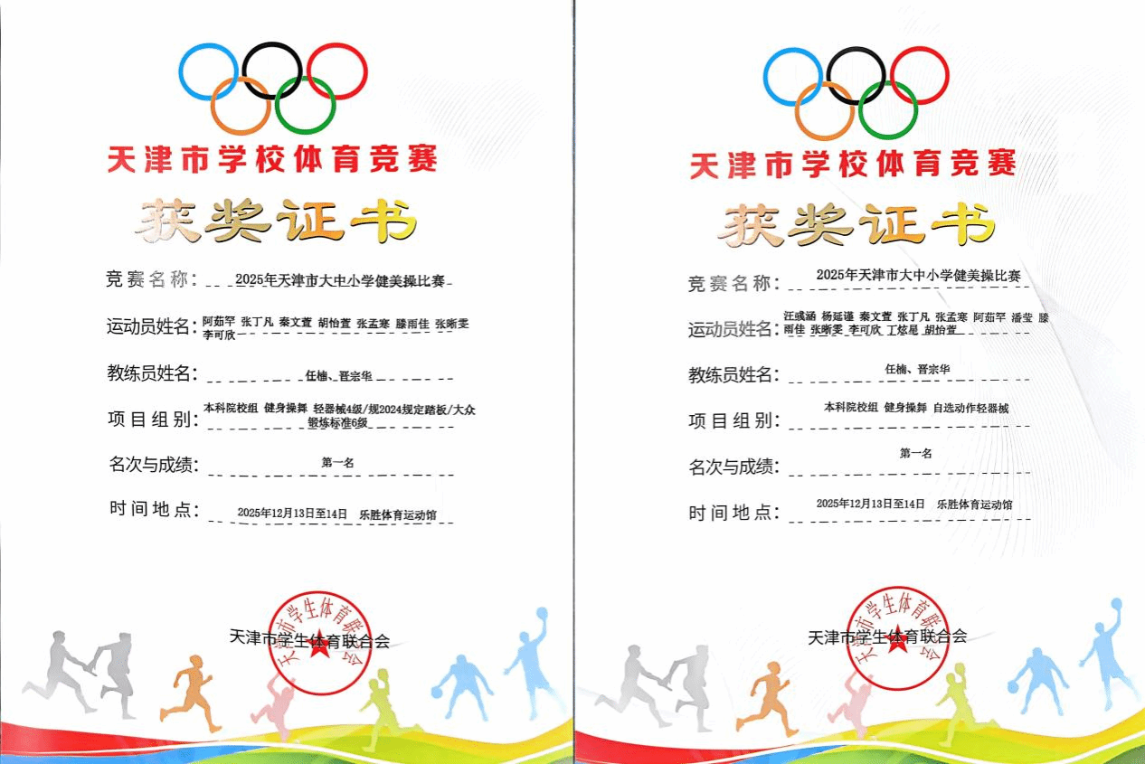 本网讯【通讯员 任楠】12月14日,2025年天津市大中小学健美操比赛圆满落幕。我校健美操队在“大众锻炼标准六级”和“自选动作轻器械”两个项目组别的比赛中表现优异,双双斩获第一名,展现了天职师大学子昂扬向上的精神风貌和扎实的专业素养。