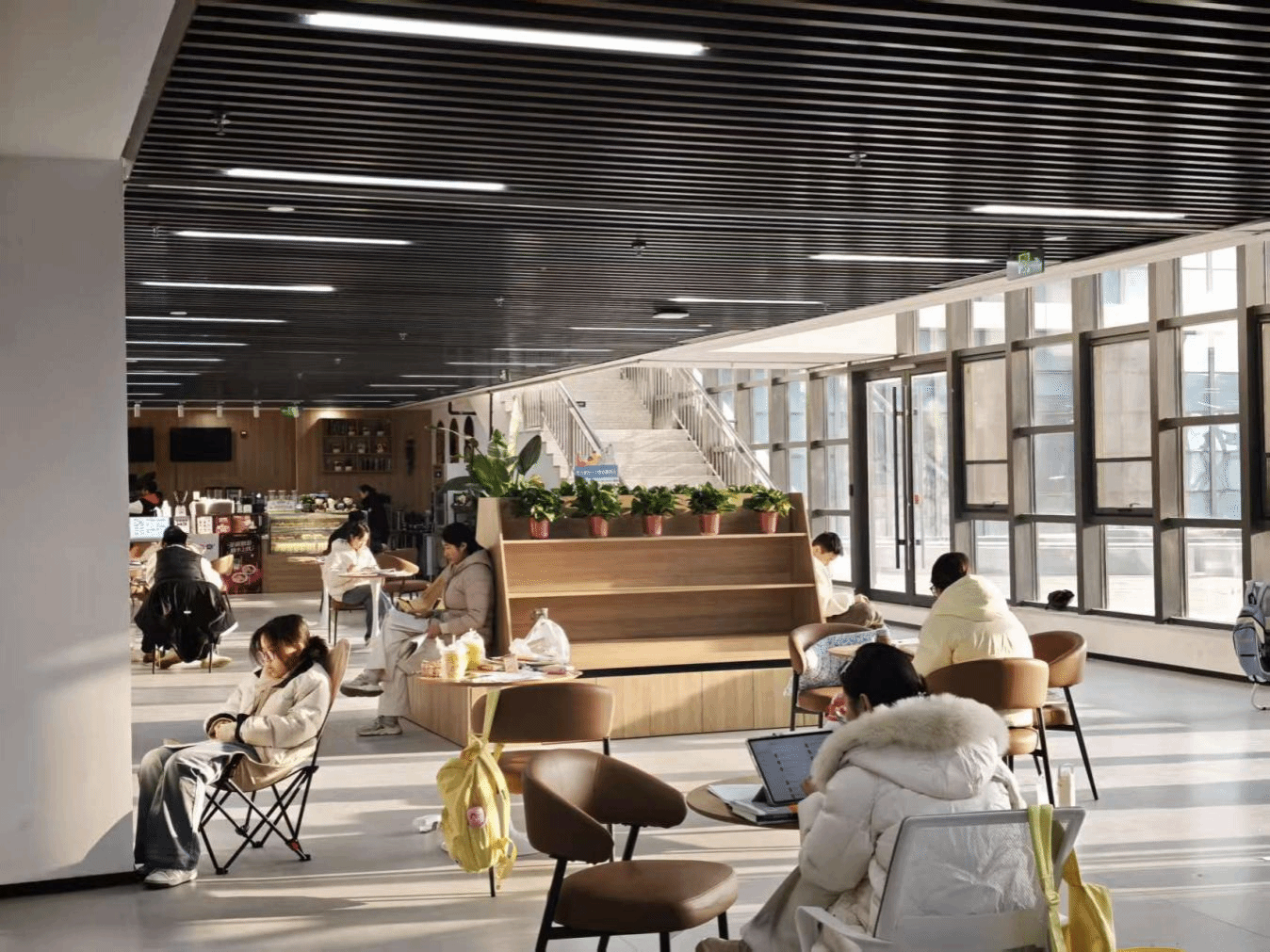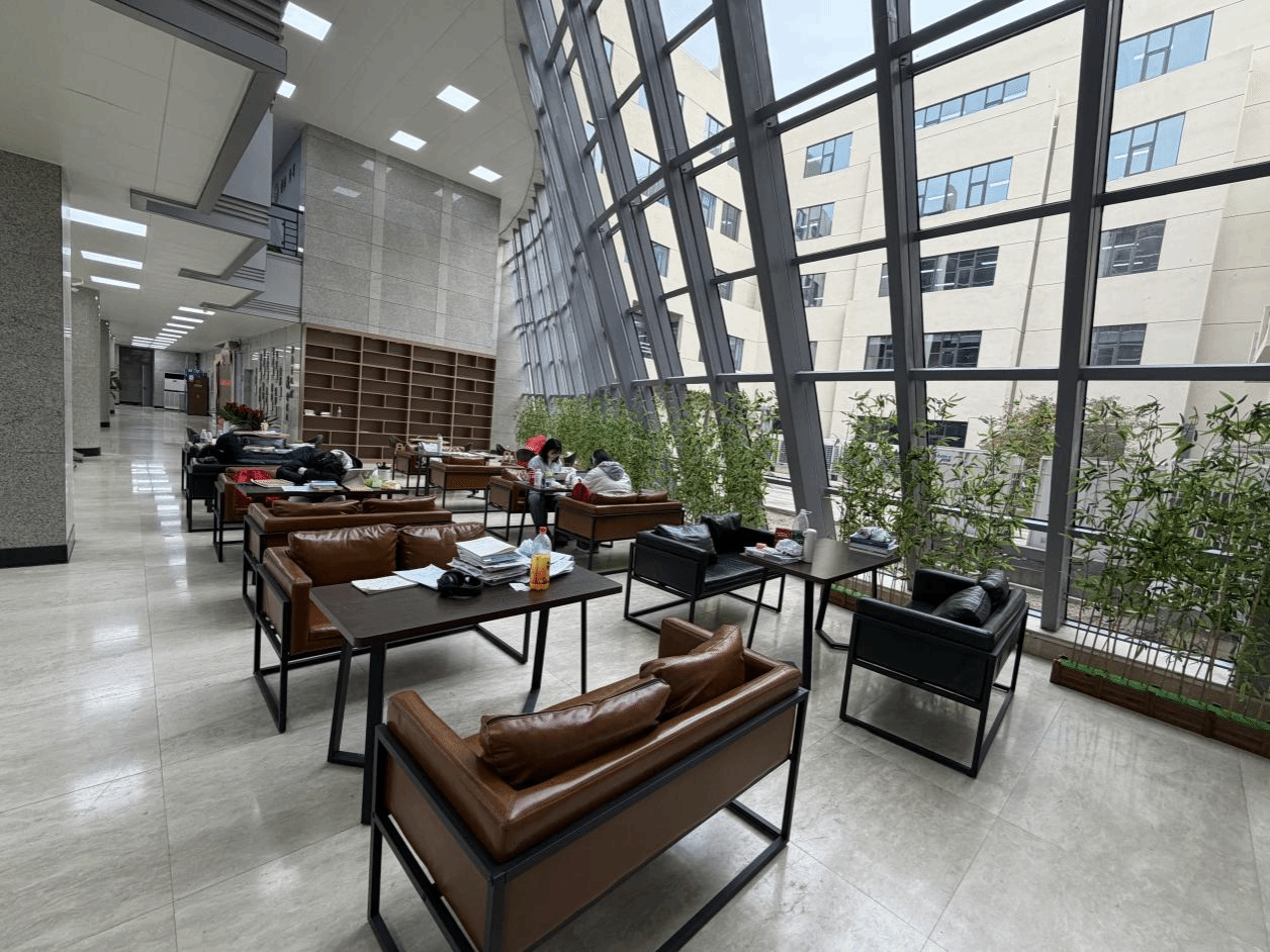 三大站点功能各异,精准匹配多元需求,全方位服务师生:技能实训楼“加油小站”位于四层,堪称“全能型学习休闲港”,吧台提供饮品服务,配备沙发座、高脚凳、共享长桌等;静音自习区配备护眼台灯和静音隔断,沉浸式学习避免打扰;交流活动区配备投影、移动白板,满足社团活动及学术研讨需求;文创展示区陈列学校师生文创作品,展示青春创意。图书馆“加油小站”位于一层,主打“便捷补给 + 舒适阅读”的双重体验,配备自助咖啡机、饮品机、食品售卖机及打印设备等基础设施,座椅加装软包垫,窗边增设休闲沙发,全面更新角落座椅,并辅以绿植装饰,营造出温馨舒适的阅读环境。师资培训楼“加油小站”位于一楼大堂北侧,定位“精致服务+文化窗口”,主要服务于培训学员及来访嘉宾,设有休闲沙发及咖啡设备,打造舒适的交流休憩场所;文化展板系统展示学校办学成果,成为彰显学校特色的重要载体。