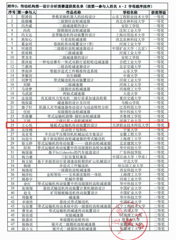 王心悦同学以“链板式运输机传动装置的设计”为题,将理论知识与实际应用紧密结合,基于严谨的工程逻辑与前沿的技术应用,撰写了高质量设计文档展示逻辑严密的设计过程,绘制了符合规范的装配图和零件图表达设计结果,提供了完整的三维模型数字化呈现设计结构,进行了有限元分析优化确保结构的安全性与可靠性,并凭借优异的答辩表现,从全国众多高校参赛作品中脱颖而出,荣获本次竞赛一等奖,我校也成为天津地区高校除天津大学以外唯一获得一等奖的高校。