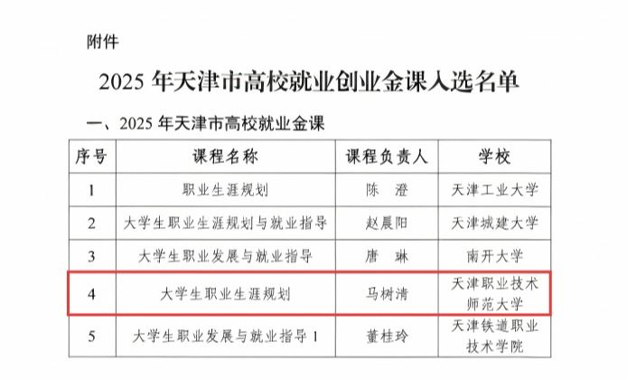 本网讯【通讯员 马树清】近日,天津市教育两委正式公布了2025年天津市高校就业创业金课入选名单,我校党委学生工作部辅导员马树清申报的《大学生职业生涯规划》课程成功入选。