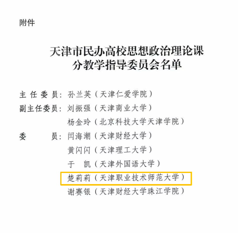 此次楚莉莉成功入选天津市民办高校思想政治理论课分教学指导委员会委员,不仅是其个人教学成果的有力彰显,更体现了天津市教育两委对我校思政课教学工作的高度肯定与认可。我校将以此为契机,持续深化思想政治理论课教学改革创新,不断提升思政课育人实效,推动学校思想政治理论课教育教学工作再攀新高。