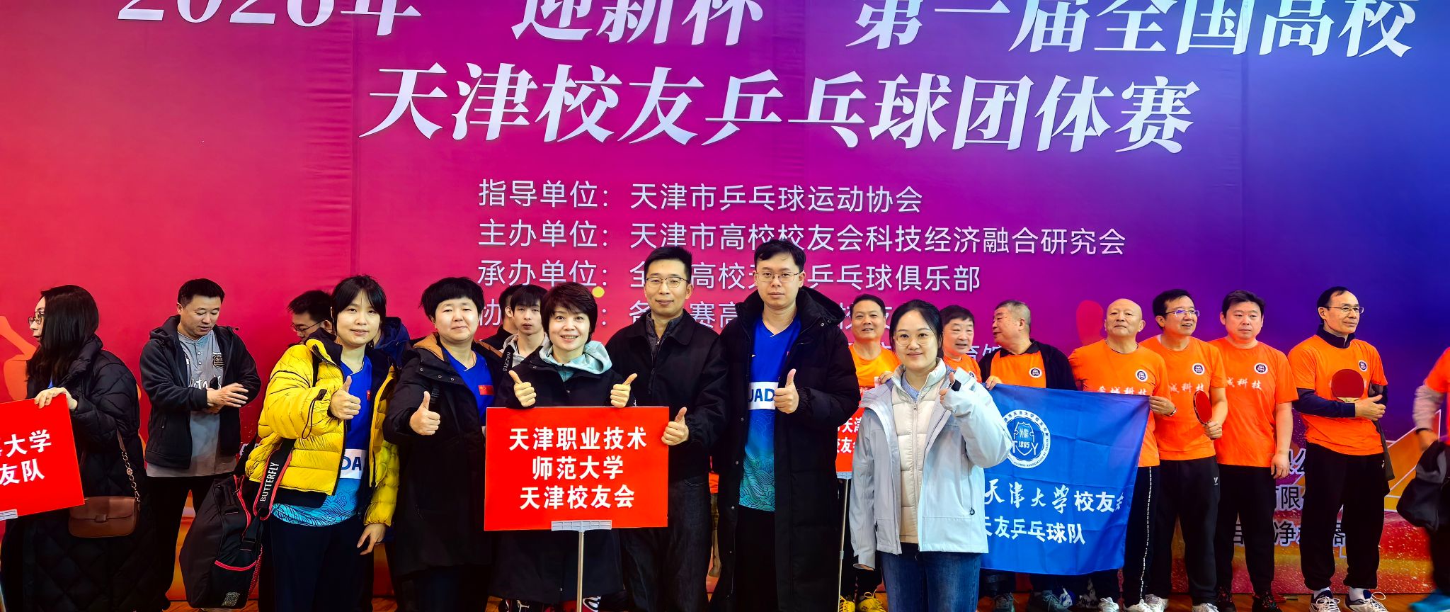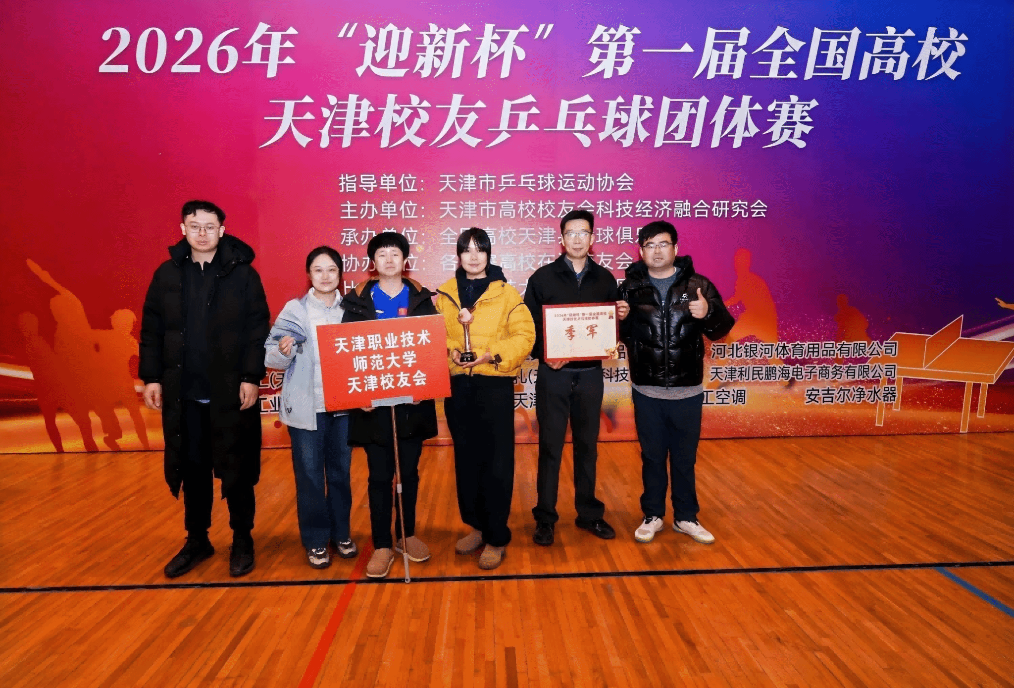 本网讯【通讯员 刘翔】1月3日,2026年“迎新杯”第一届全国高校天津校友乒乓球团体赛在天津科技大学(河西校区)体育馆圆满落幕。经过激烈角逐,我校天津校友会代表队凭借出色表现斩获季军,展现了天职师大人团结拼搏的精神风貌。