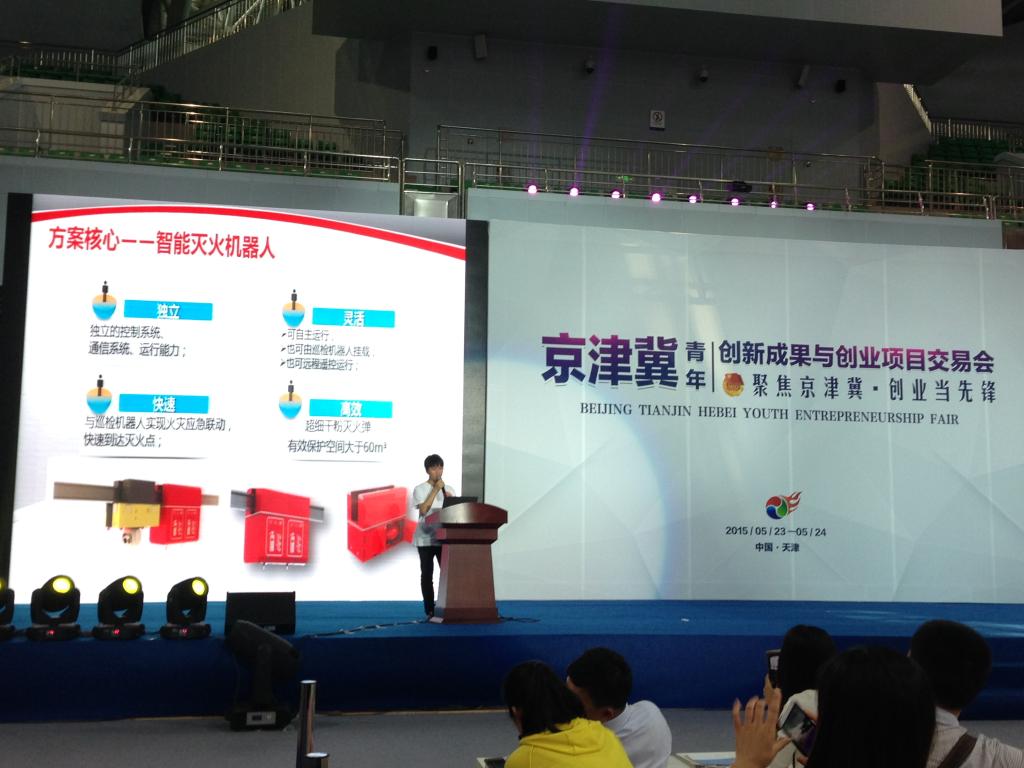 本次京津冀青年创新成果与创业项目交易会持续两天。我校第三届“安正路·校友杯”创业大赛的参赛项目“电力巡检机器人”在24日代表我校进行了项目路演,获得在场观众及投资人的好评。