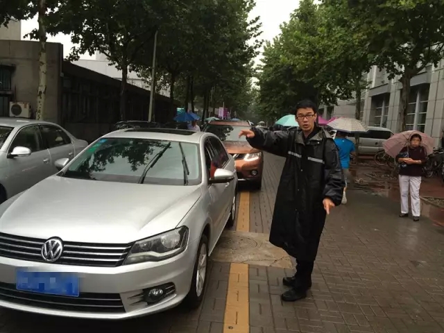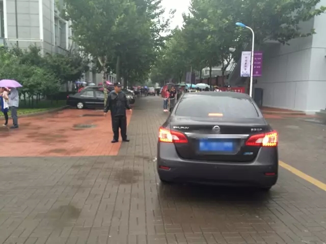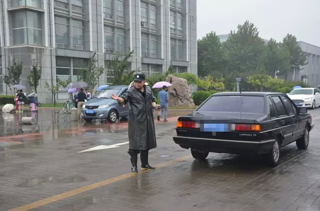 保卫处工作人员冒雨维持校园安全秩序。