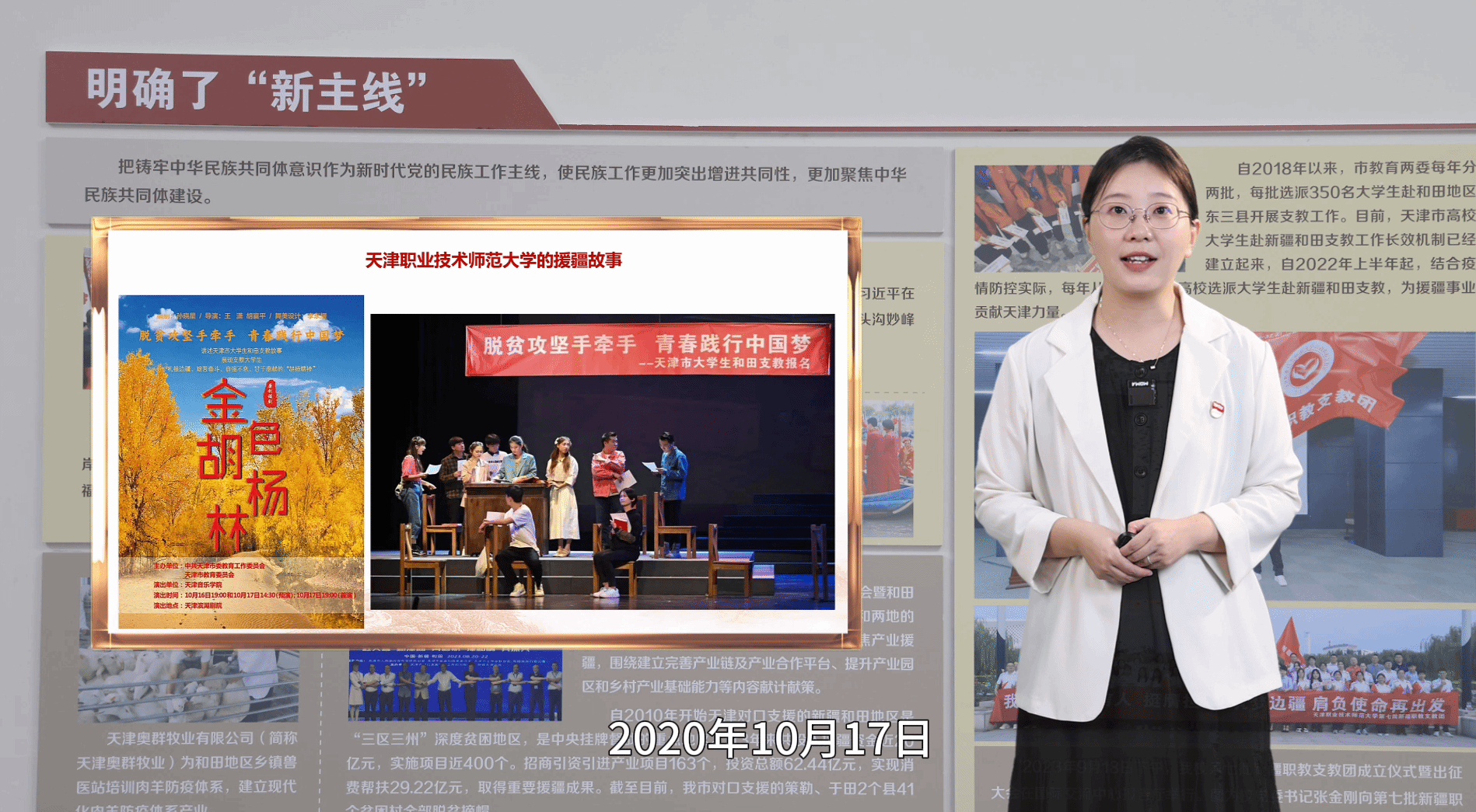我校此次推荐的微党课《脱贫攻坚 画出中华民族同心圆》以习近平总书记关于脱贫攻坚和铸牢中华民族共同体意识重要论述为指导,立足脱贫攻坚伟大实践,从党旗领航、携手跨越、文化互鉴、情感交融四个维度,深刻阐释脱贫攻坚对铸牢中华民族共同体意识的重大意义。党课创新地将课堂搬进“天津市铸牢中华民族共同体意识教育实践思政课重点实验室”,充分利用场馆内的立体“活教材”,打造沉浸式学习场景。讲授中,以小切口讲授大道理,既展现独龙族整族脱贫、悬崖村蝶变等图景,更融入天津杨柳青年画与新疆桑皮纸的文化交融、天津职业技术师范大学师生接力援疆支教等身边故事,让各民族像石榴籽一样紧紧抱在一起的深刻道理可感可触,从而教育引导学生深刻理解休戚与共、荣辱与共、生死与共、命运与共的共同体理念,积极投身中华民族共同体建设,为实现中华民族伟大复兴汇聚青春力量。