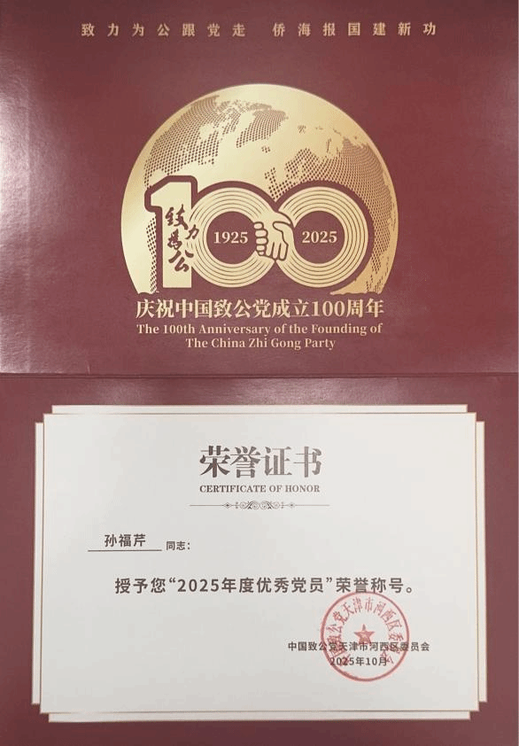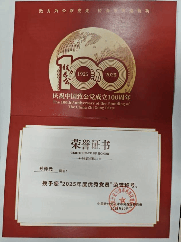 另悉,理学院院长孙福芹、电子工程学院教师孙仲元获评致公党河西区“2025年度优秀党员”。