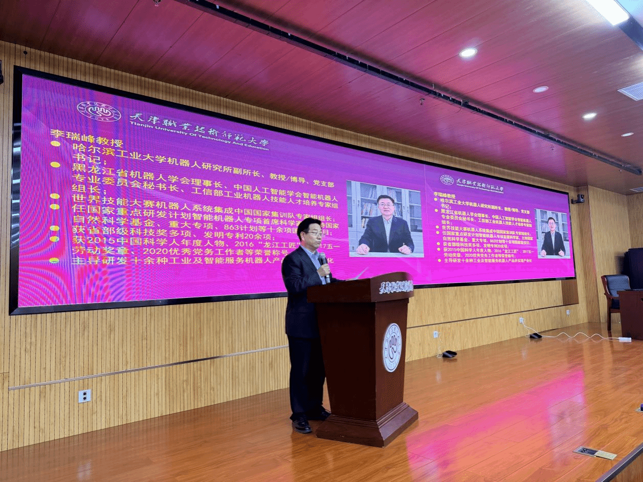本网讯【通讯员 周广方】为助力我校师生深入了解机器人技术前沿方向、精准把握行业发展脉搏,进一步夯实教学科研基础、切实提高学校“工匠之师”培养质量,3月17日下午,由教务处、世界技能大赛中国(天津)研究中心、世界技能大赛中国研究(研修)中心和集训基地联盟办公室联合举办的“机器人系统集成技术的发展及人才培养”专题讲座在师资培训楼二楼报告厅成功举办。讲座特邀哈尔滨工业大学李瑞峰教授担任主讲。校党委常委、副校长蔡玉俊出席并主持。