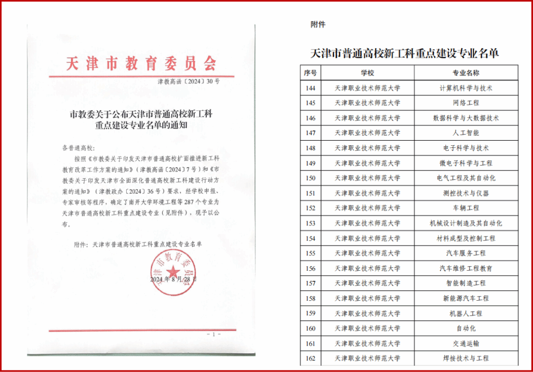 聚焦国家职业教育与区域经济社会发展的战略需求,立足“新师范、新工科、新文科”融合发展的总体格局,秉持“师范类专业做精做特、应用型专业做实做强”的建设思路,近年来增设以“智能+”为导向、面向未来发展的新工科、新文科专业9个。获批天津市级及以上一流本科专业建设点21个,天津市级新工科重点建设专业19个、产教融合型品牌专业培育点4个。在深度贯彻OBE教育理念、系统修订专业人才培养方案过程中,为各专业改革发展开辟出崭新路径。以微专业建设为有力抓手,聚焦核心课程,依托多元灵活的培养方式,着力造就知识面宽、适应能力强的复合型人才,7个微专业入选教育部“双千计划”备案名单。