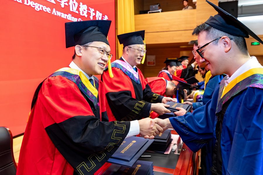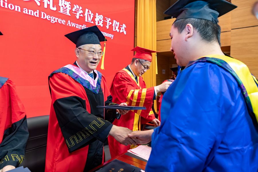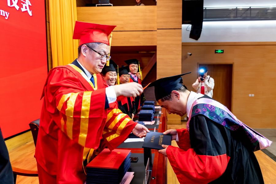 在学位授予仪式上,主席台领导为毕业研究生逐一拨穗正冠、颁授学位证书与毕业证书,并与同学们亲切合影留念,定格下这一珍贵美好瞬间。
