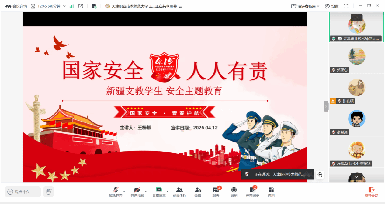 在面向受援学校广泛开展安全教育的同时,一场别开生面的线上国家安全专题学习会,打破空间壁垒,将分散在四地的支教团队员紧密联结在一起。屏幕之上,策勒分队带队教师王梓希担任主讲,课件主题鲜明、条理清晰,讲解深入浅出、重点突出;屏幕之下,全体队员整齐就座、专注聆听、认真记录,学习氛围浓厚而庄重。“我们分散在四个县市,但守护国家安全的责任是共同且相通的。尤其在民族地区,我们每位队员的言行都是一面窗口,我们的认知与判断直接关系到工作的根基。”王老师的讲授从宏观形势切入,紧密联系支教工作实际,聚焦于在复杂环境下如何维护意识形态安全、文化安全,以及防范化解各类风险。她通过具体的场景假设和案例分析,为队员们提供了极具操作性的工作指引。虽然隔着屏幕,但学习的氛围严肃而热烈。在线上交流环节,各分会场的队员纷纷打开麦克风,结合各自所在地的实际情况,分享见解、提出问题,进行“云端”研讨。这场跨越空间的集体学习,不仅强化了理论武装,更凝聚了团队共识。据悉,支教团已将国家安全专题学习纳入党、团支部学习内容,后续将围绕不同重点领域,由各带队教师陆续开展系列深度辅导,持续强化支教团队自身的政治判断力、风险辨识力与防护能力。