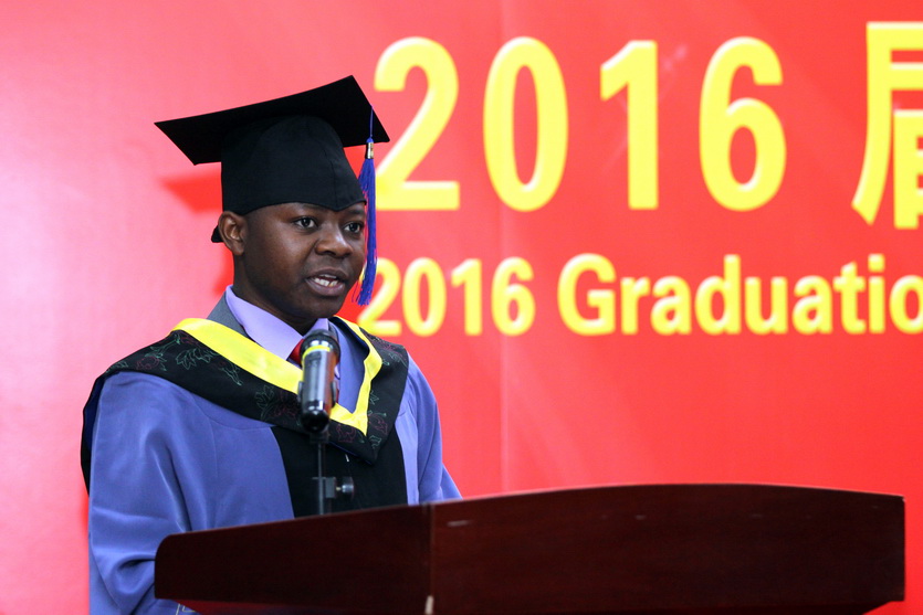 毕业生代表大海在发言中说:“三年的研究生时光结束了,我们已从渴求知识的新生,成长为略有所成的毕业生。‘业精于勤荒于嬉’,希望大家在学期间努力的钻研学问,不负光阴。”同时,大海还代表全体留学生向母校教职工的辛勤奉献表达了由衷的感谢。