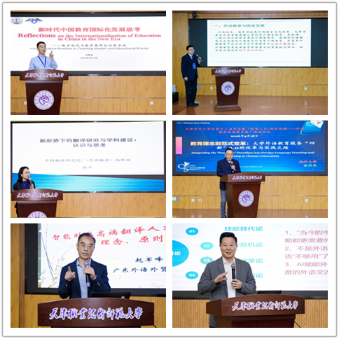 在主论坛上,教育部鲁班工坊建设专家委员会主任吕景泉教授、四川外国语大学董洪川教授、中国翻译研究院及《中国翻译》编辑部杨平教授、扬州大学俞洪亮教授、广东外语外贸大学赵军峰教授、天津外国语大学王铭玉教授,分别以《新时代中国教育国际化发展思考 —— 教学模式与教育品牌的创新实践》《新时代外语教育的学科使命与历史承担》《新形势下的翻译研究与学科建设:认识与思考》《从教育理念到范式变革:大学外语教育教学“四新”2.0的改革与实践之路》《智能时代高端翻译人才培养(DTI):理念、原则与进路》《逆境下的外语发展》为题作主旨报告。吕景泉教授介绍了鲁班工坊建设成就,阐释品牌核心要义与 EPIP 教学模式,分享中国职业教育国际化成果经验;董洪川教授阐明新时代外语教育服务国家战略的学科使命与历史承担;杨平教授提出应构建中国特色翻译理论体系,以人文精神引领人工智能时代的翻译研究与人才培养;俞洪亮教授阐释大学外语教育“四新”2.0改革逻辑,提出重构教育生态、深化数智融合与“外语 + 学科”融合的实施路径;赵军峰教授回顾翻译博士专业学位(DTI)发展历程,明确其培养复合型翻译领军人才的定位与发展进路;王铭玉教授批驳“外语无用论”,强调外语教育应强化人文属性与“外语 + 专业”融合,培养具备家国情怀、全球视野与数字素养的实战型人才,各位专家的报告分别从职业教育国际化、外语教育使命、翻译学科建设、教学范式改革、高端翻译人才培养及外语发展路径等方面,为新时代教育国际化与外语学科高质量发展提供了重要思路与启示。