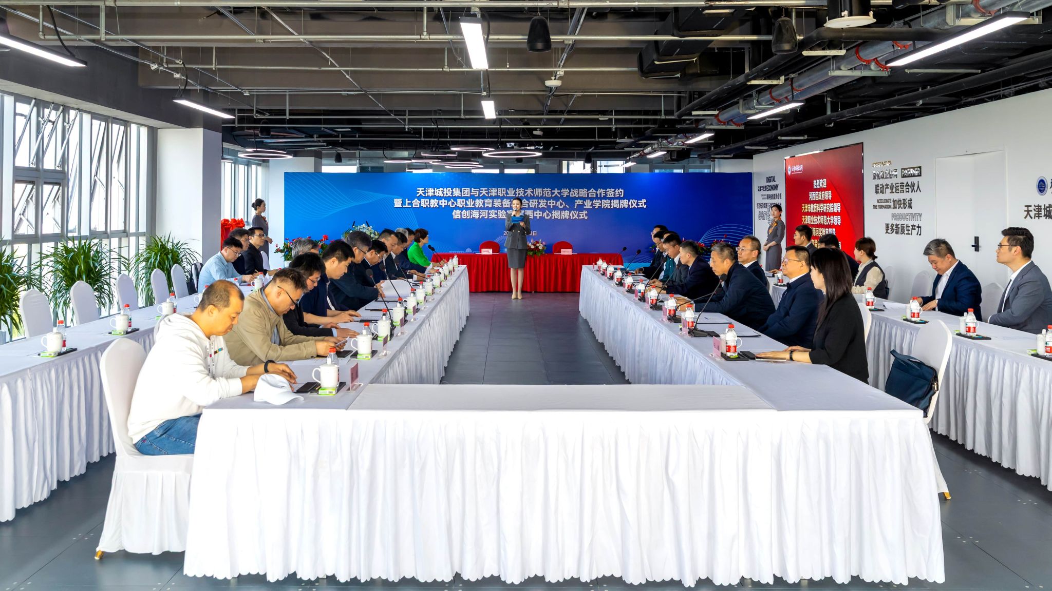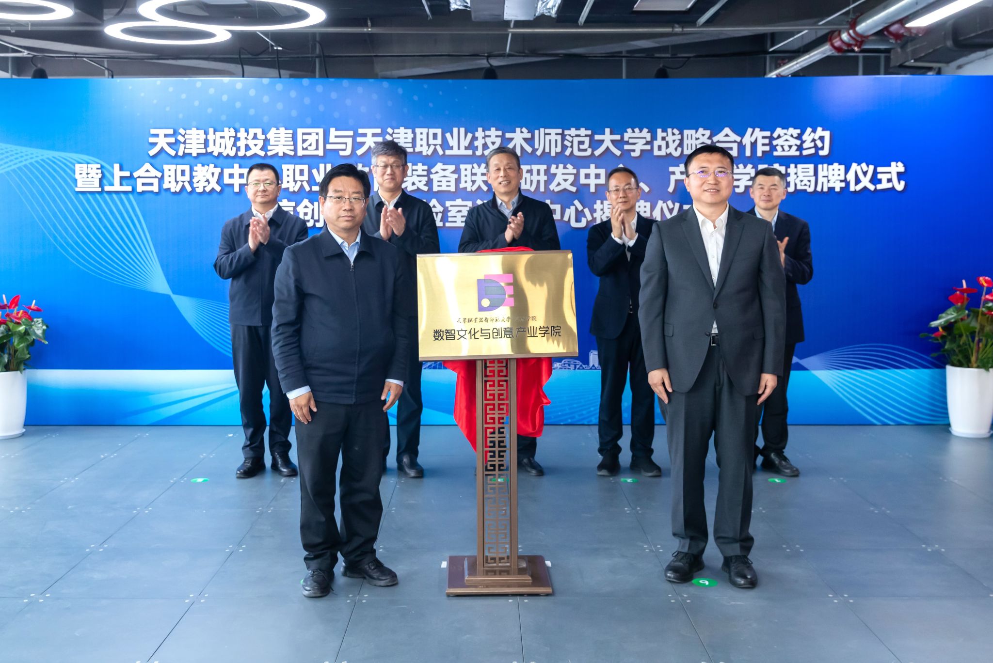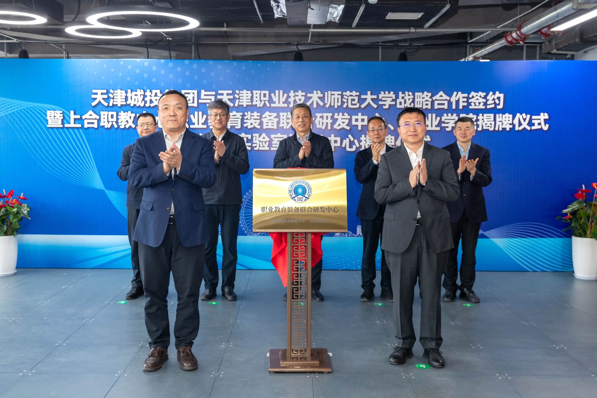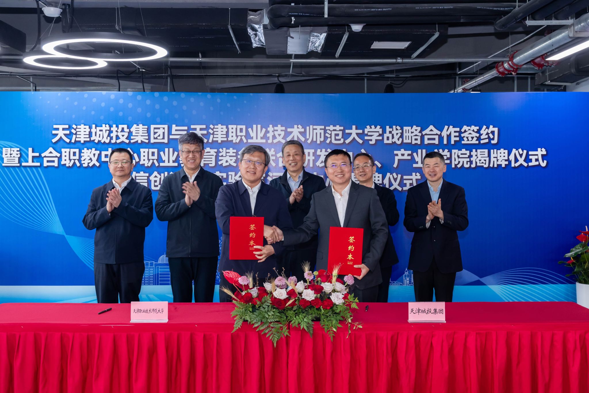 本网讯【通讯员 吴远志 魏兵】4月23日,天津职业技术师范大学与天津城投集团战略合作签约暨上合职教中心职业教育装备联合研发中心、产业学院揭牌仪式及信创海河实验室河西中心揭牌仪式在智汇中心大厦隆重举行。河西区委常委、常务副区长孙文秀,天津市教育科学研究院党委书记张华泉,我校党委书记、校长郑清春,天津城投集团党委书记、董事长赵鹏,信创海河实验室副主任李涛,校党委常委、副校长蔡玉俊,副校长王劲松,校党委常委、副校长米靖等领导出席活动。此次活动是校、政、企、研多方深化协同合作的重要里程碑,也是落实上海合作组织天津峰会重大成果、服务产教融合与“两创融合”的生动实践。