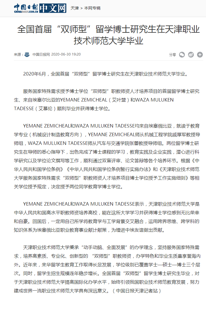 YEMANE ZEMICHEAL和WAZA MULUKEN TADESSE表示,天津职业技术师范大学是中华人民共和国高水平职教师资培养高校,能在这所大学学习并获得博士学位感到无比荣幸和自豪。回国后,一定用自己所学将教育学与工学背景交叉融合,运用跨界思维、跨学科的知识体系为埃塞俄比亚职业教育事业献计献策,为增进中埃友谊做出贡献。