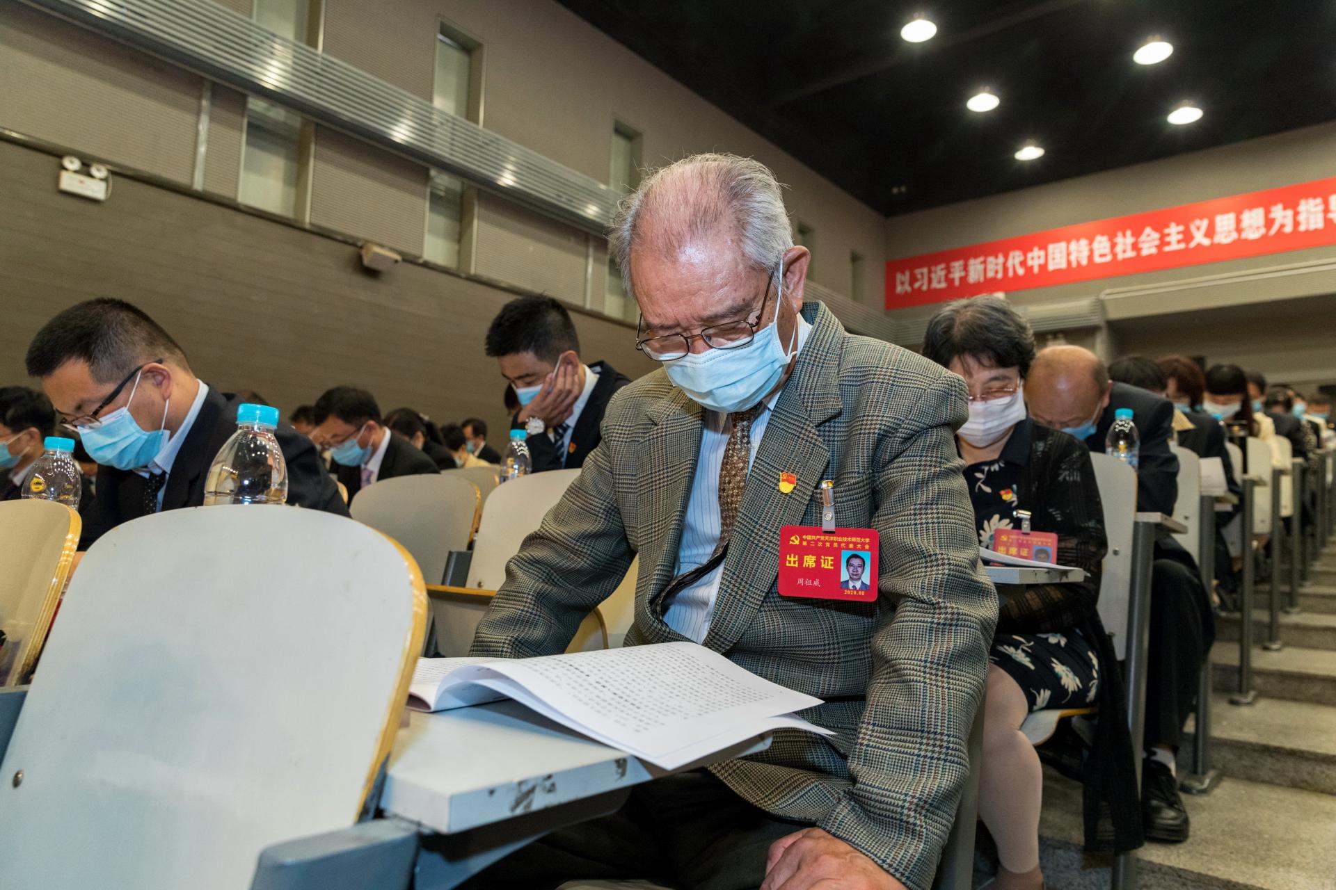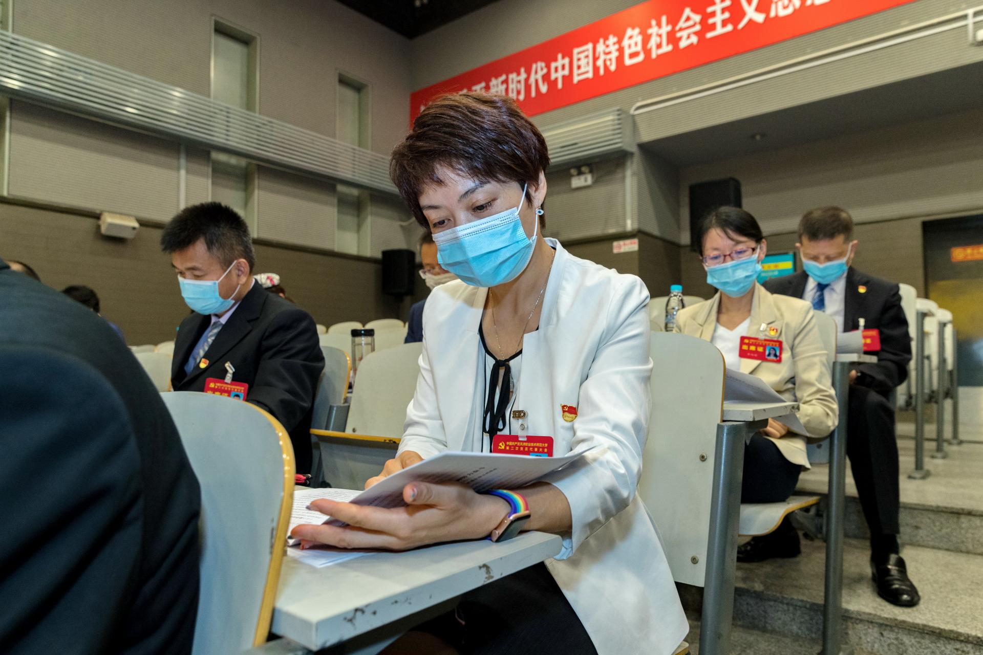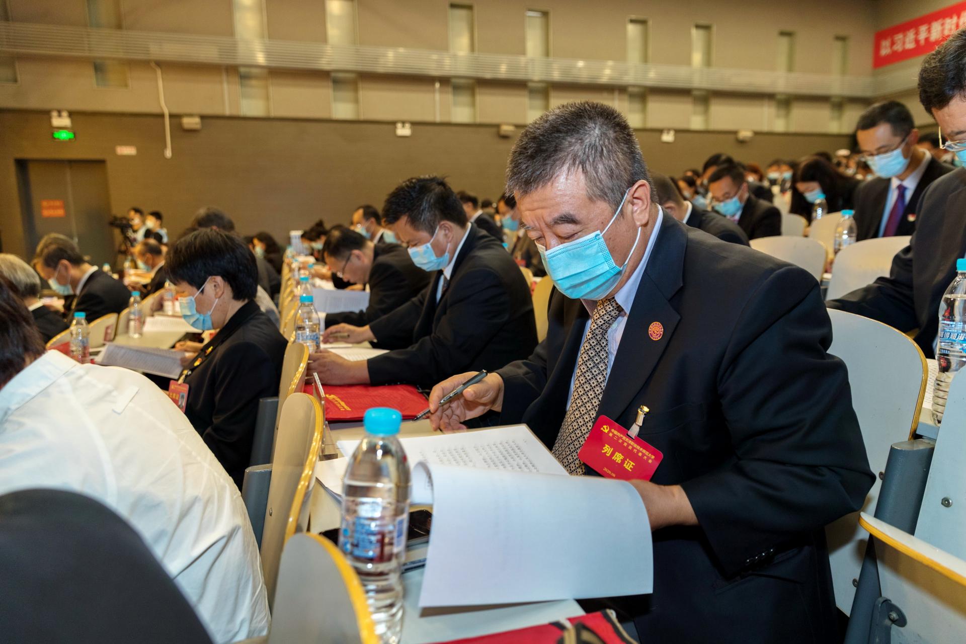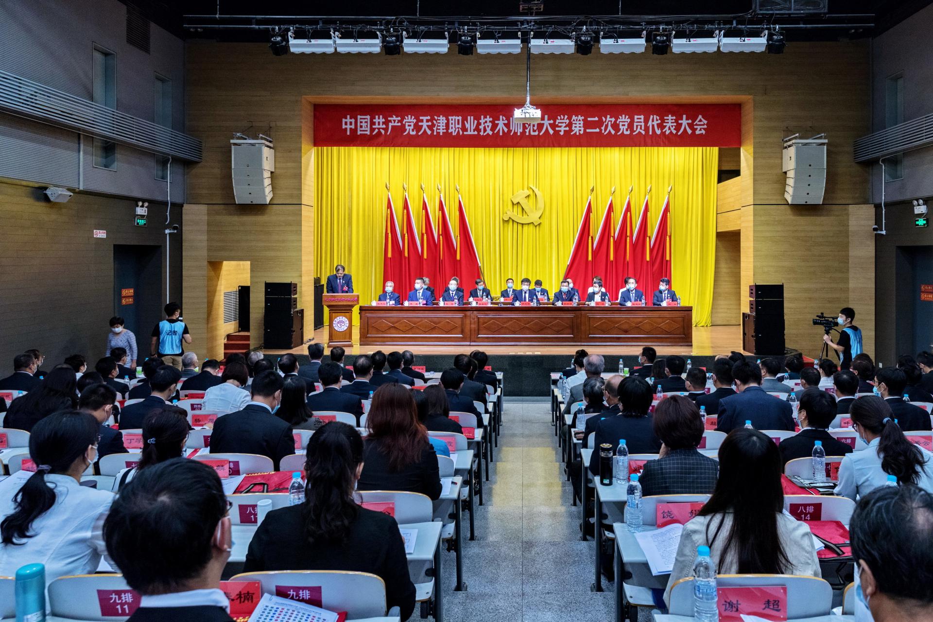 大会会场气氛庄严热烈。大会主席台上方悬挂着“中国共产党天津职业技术师范大学第二次党员代表大会”的会标,主席台帷幕中央金色的党徽光彩夺目,十面鲜艳的红旗分列两侧。
