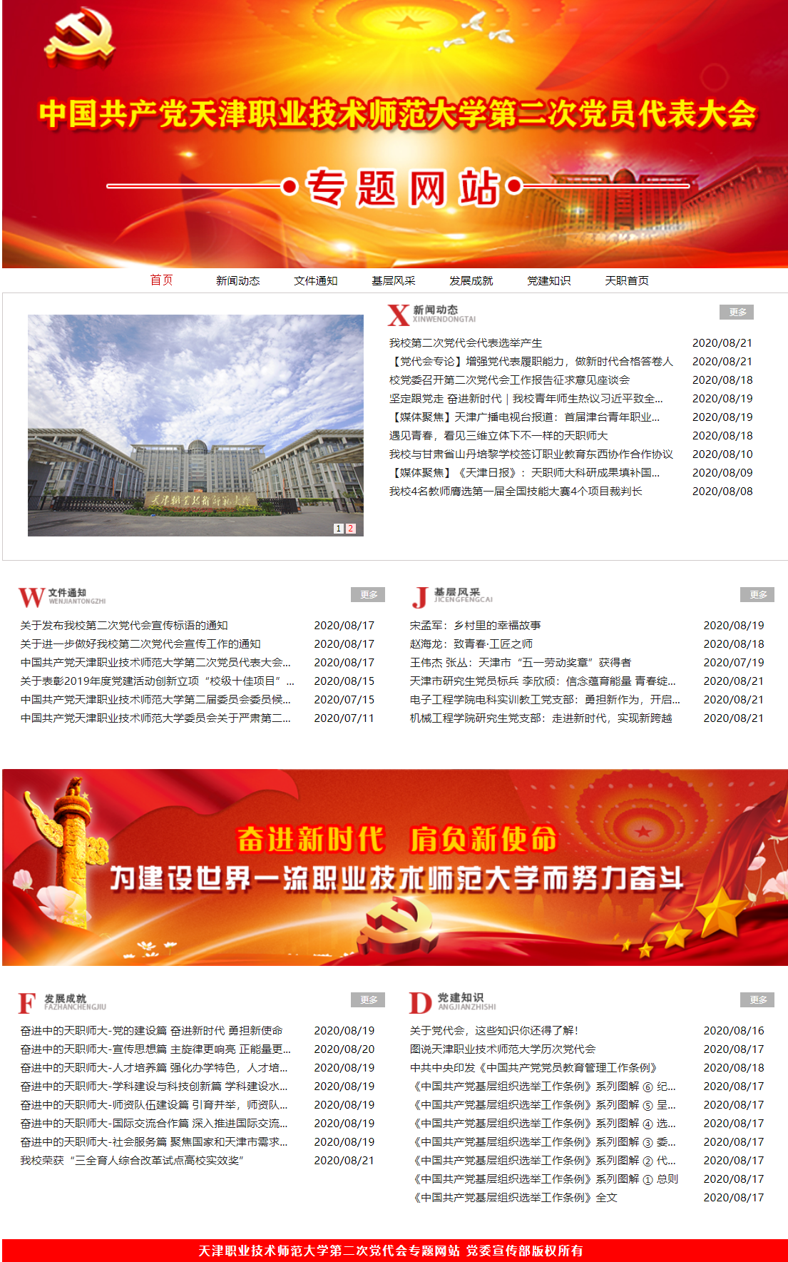 专题网站精心设计了“新闻动态”、“文件通知”、“基层风采”、“发展成就”、“党建知识”等5个栏目。“新闻动态”聚焦学校筹备、召开党代会及贯彻落实党代会精神的重要新闻及系列报道;“发展成就”盘点过去六年来学校事业发展取得的各项成就;“基层风采”展示学校涌现出的优秀党员事迹及优秀党组织的先进工作案例,分享党代表对本次大会的所见所闻所感,畅谈学校近年来党建和事业发展的切身感受;“发展成就”讲述学校改革发展中不忘初心,砥砺奋进的奋斗故事,展现全校师生奋进的精神风貌,唱响礼赞新征程、奋进新时代的昂扬旋律;“党建知识”主要介绍学校历次党代会召开情况和党建、党代会相关知识。