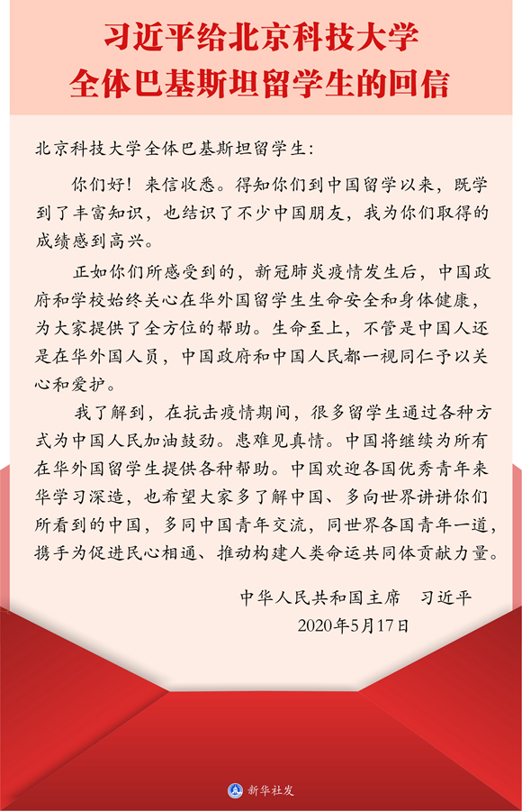 巴基斯坦留学生巴康仁、巴范书、巴山、阿南、巴楚楚等人表示:中国和巴基斯坦是全天候战略伙伴,两国之间的传统友谊在疫情期间更加稳固、更具活力。习近平主席给巴基斯坦留学生的回信彰显了中巴牢不可破的伙伴关系。对中国政府在疫情期间采取的有力措施和积极援助表示钦佩和感谢。对学校在疫情暴发后以采取严格措施保障在校留学生的安全,尽最大努力给留学生的学习和生活提供便利表示感谢。